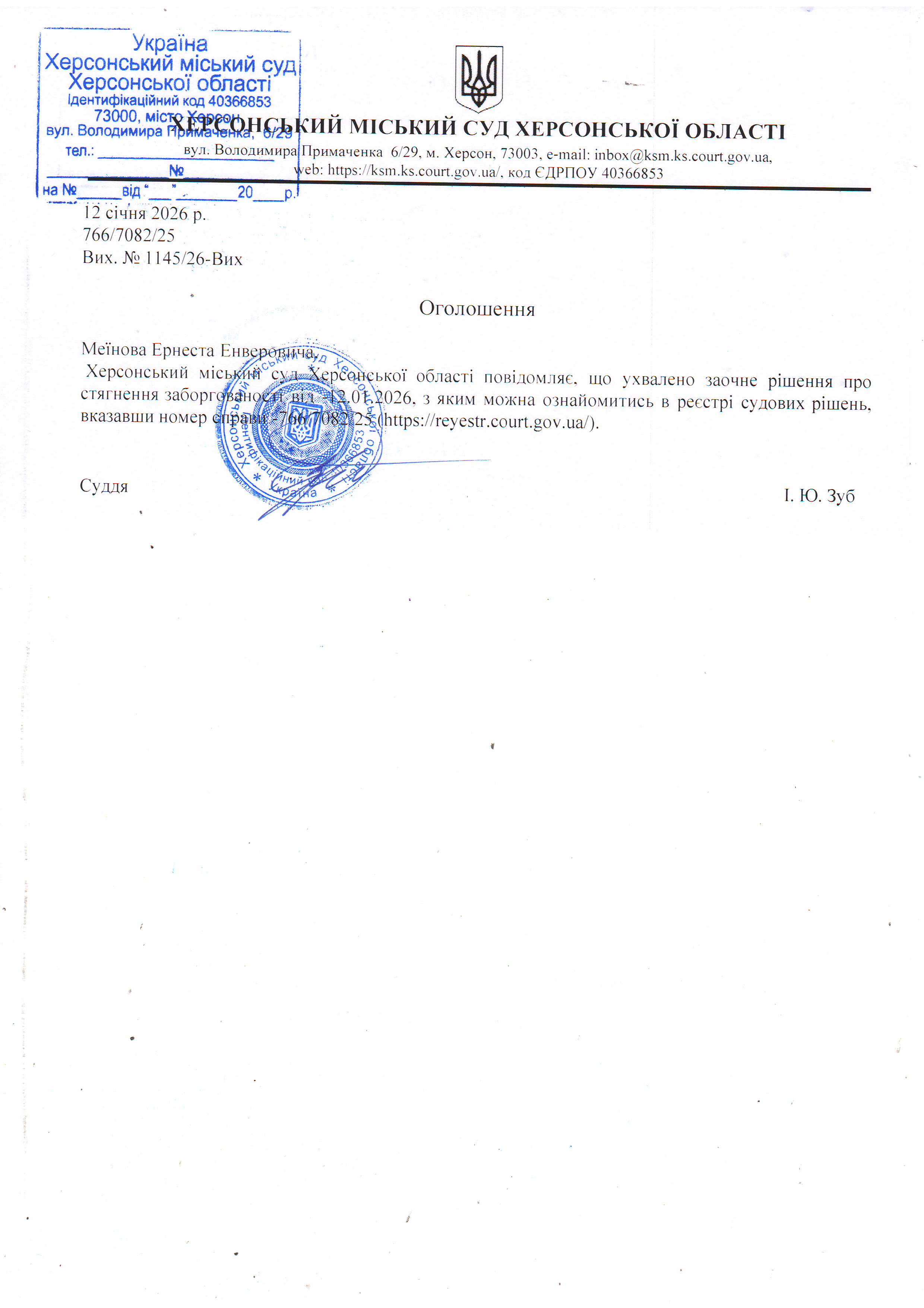 Оголошення для Меїнова Ернеста Енверовича про ухвалення заочного рішення