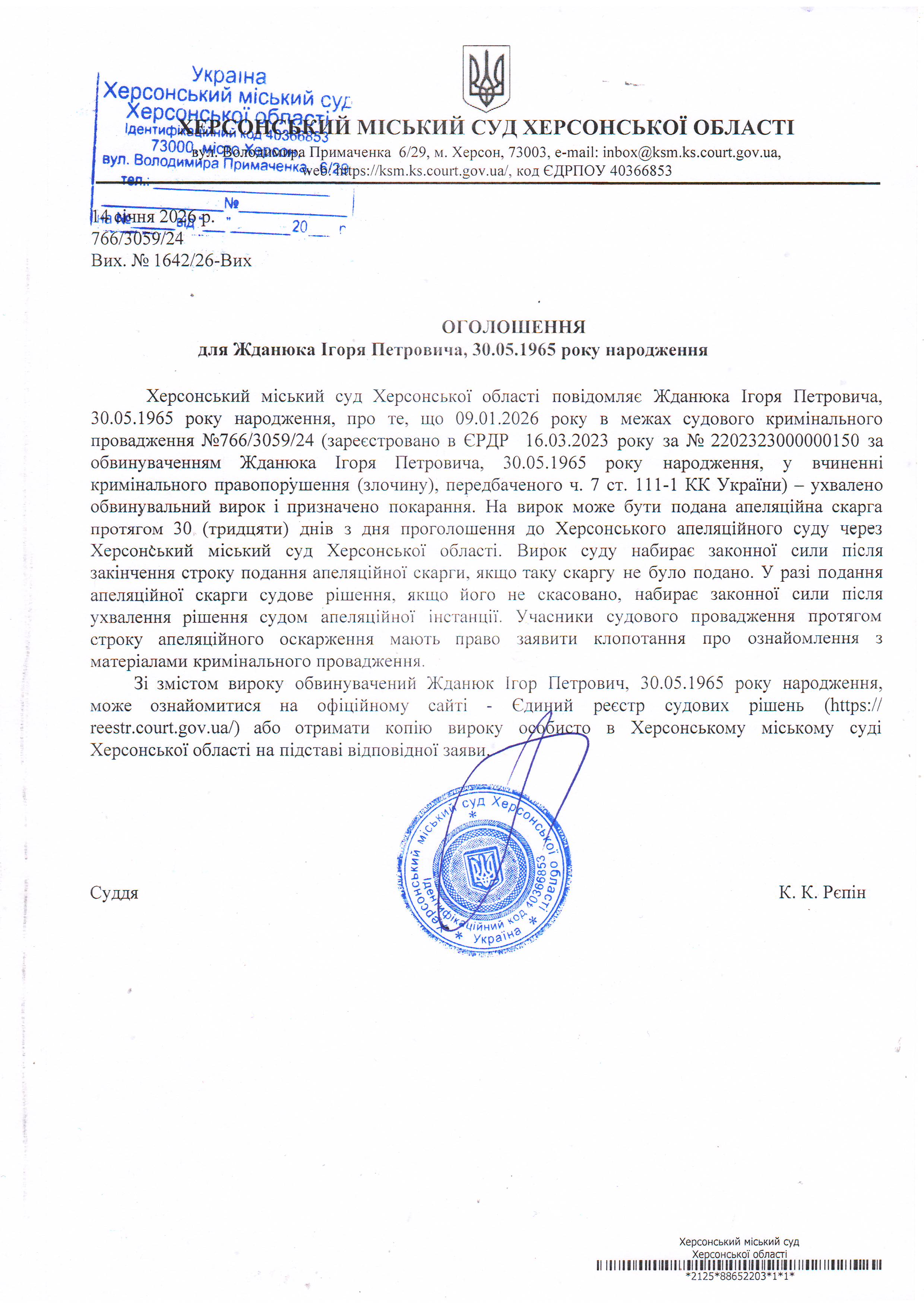Оголошення для Жданюка Ігоря Петровича про винесення вироку