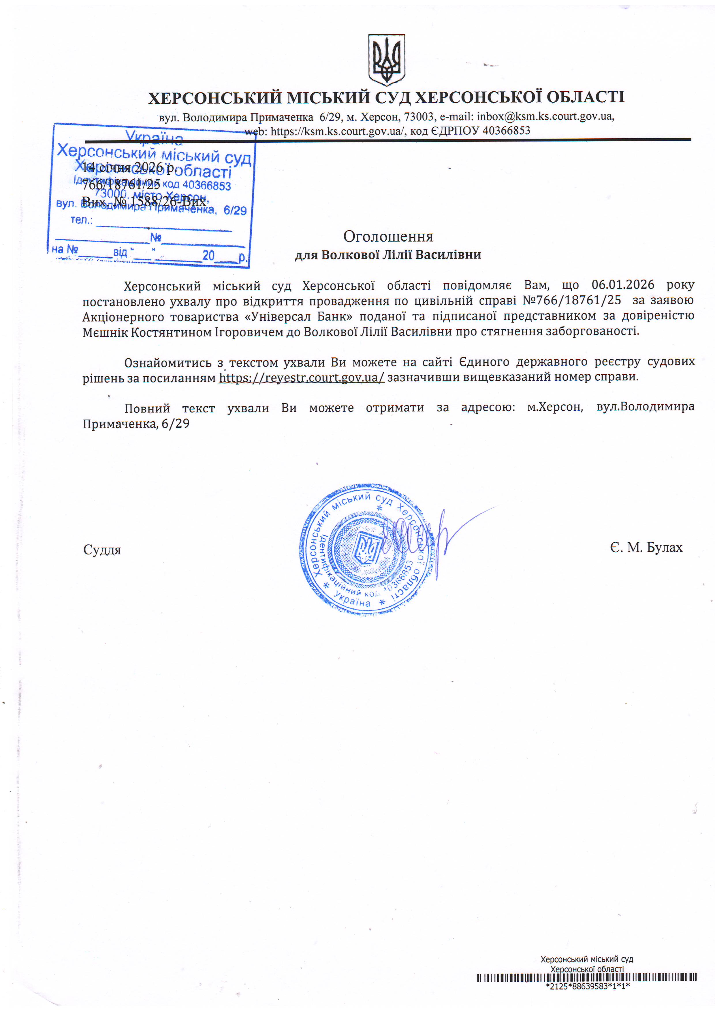 Оголошення для Волкової Лілії Василівни про постановлення ухвали