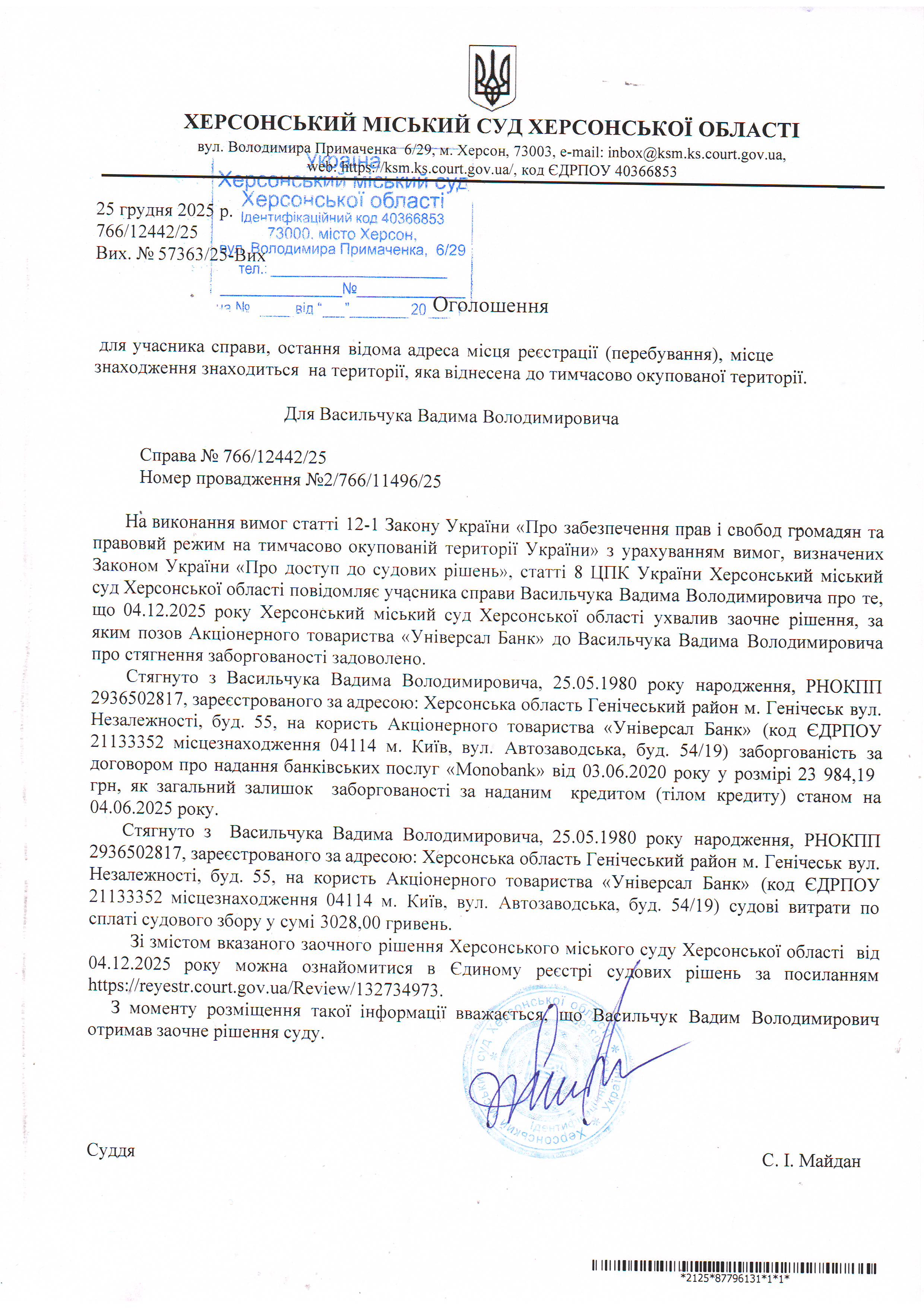 Оголошення для Васильчука Вадима Володимировича про ухвалення заочного рішення