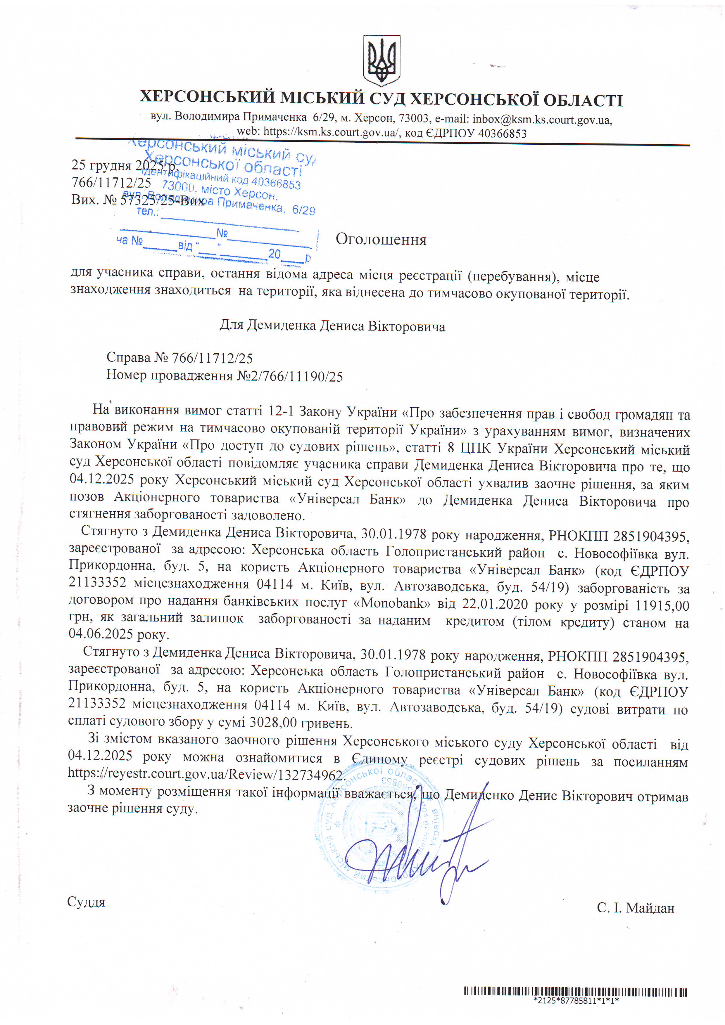 Оголошення для Демиденка Дениса Вікторовича про ухвалення заочного рішення