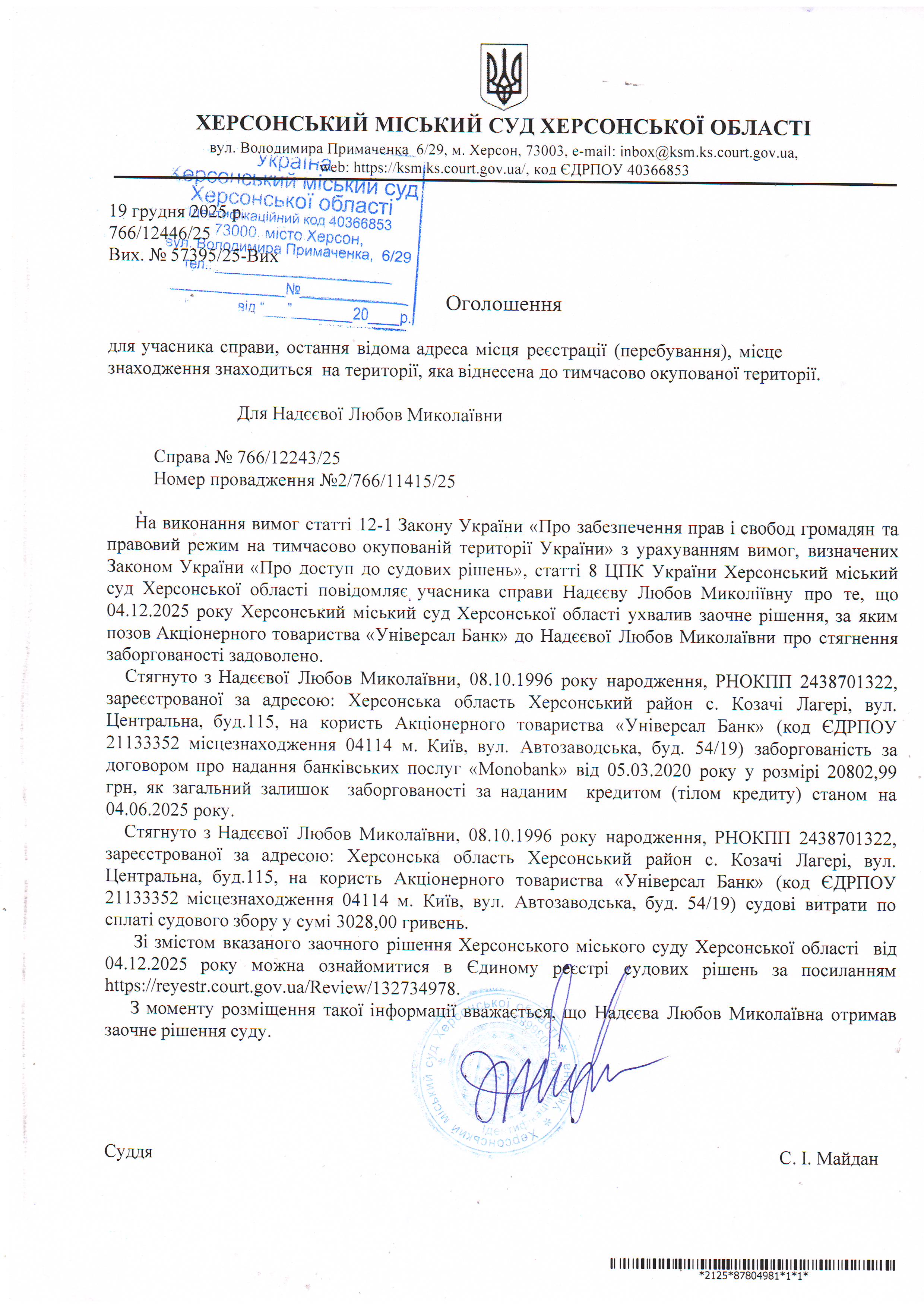 Оголошення для Надєєвої Любові Миколаївни про ухвалення заочного рішення
