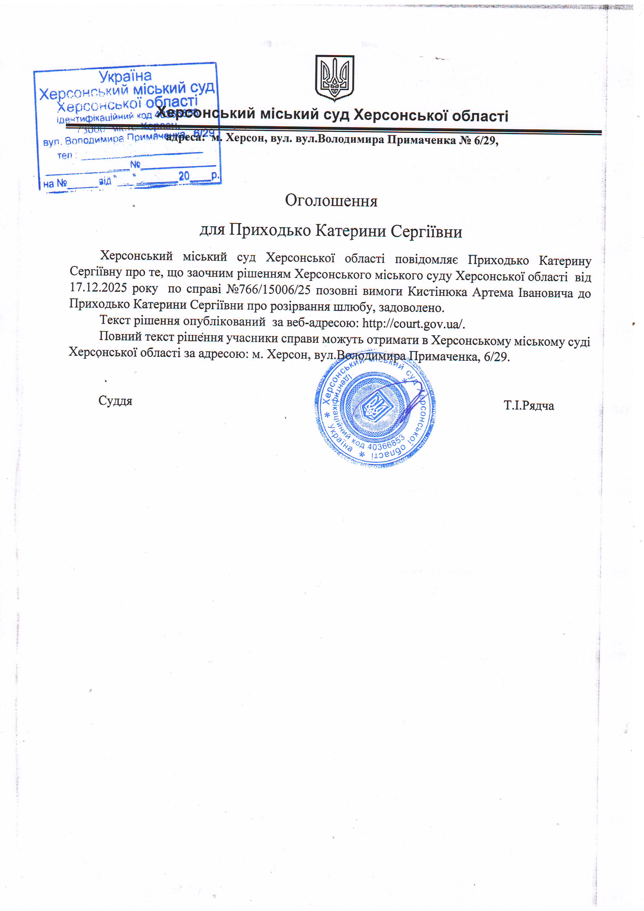 Оголошення для Приходько Катерини Сергіївни