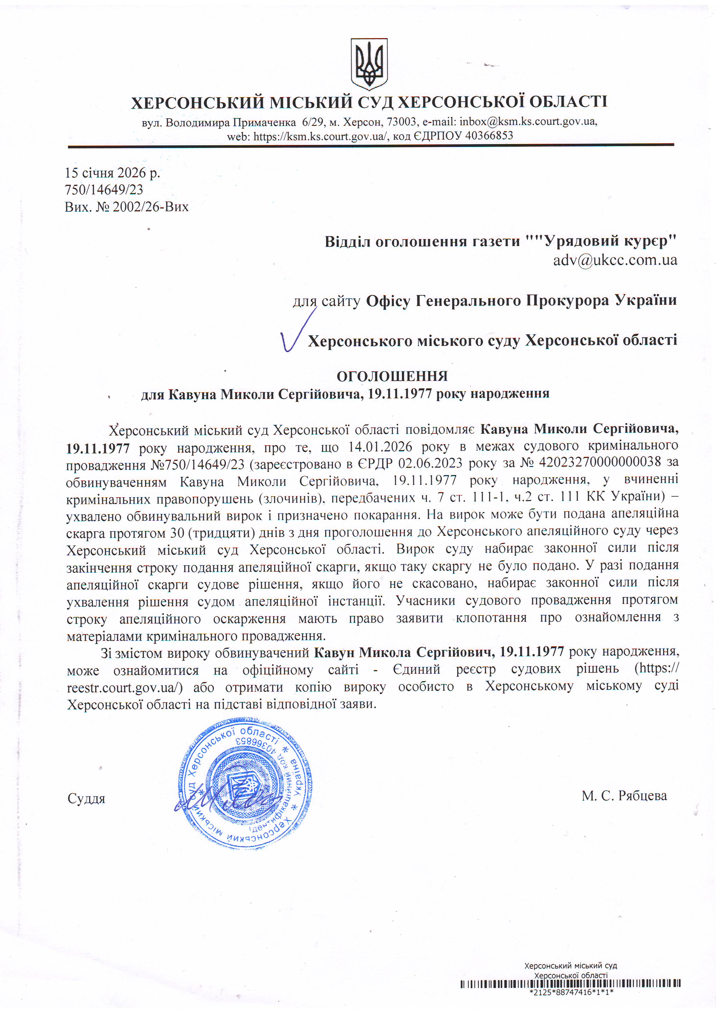 Оголошення для Кавуна Миколи Сергійовича про винесення вироку
