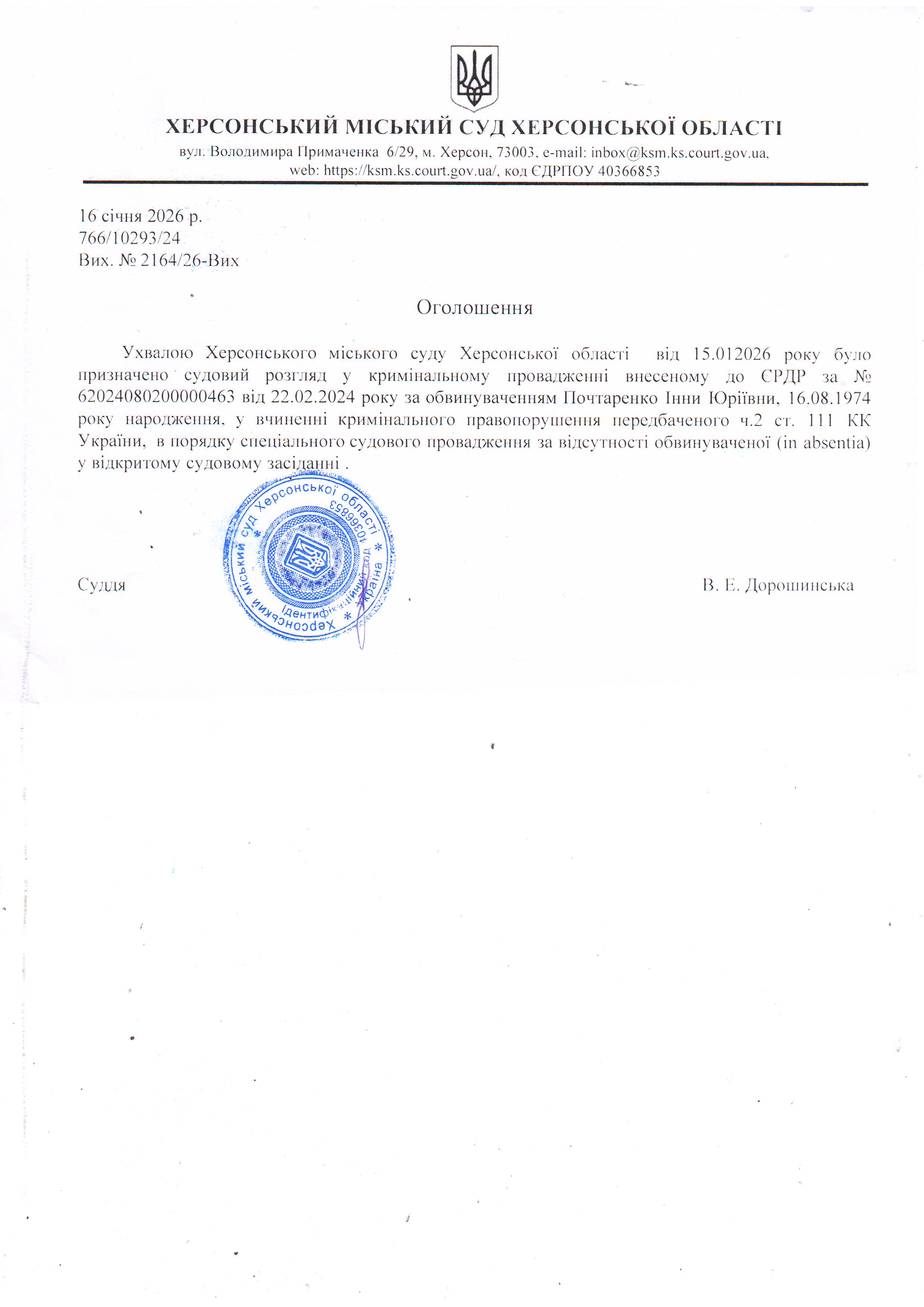 Оголошення для Почтаренко Інни Юріївни
