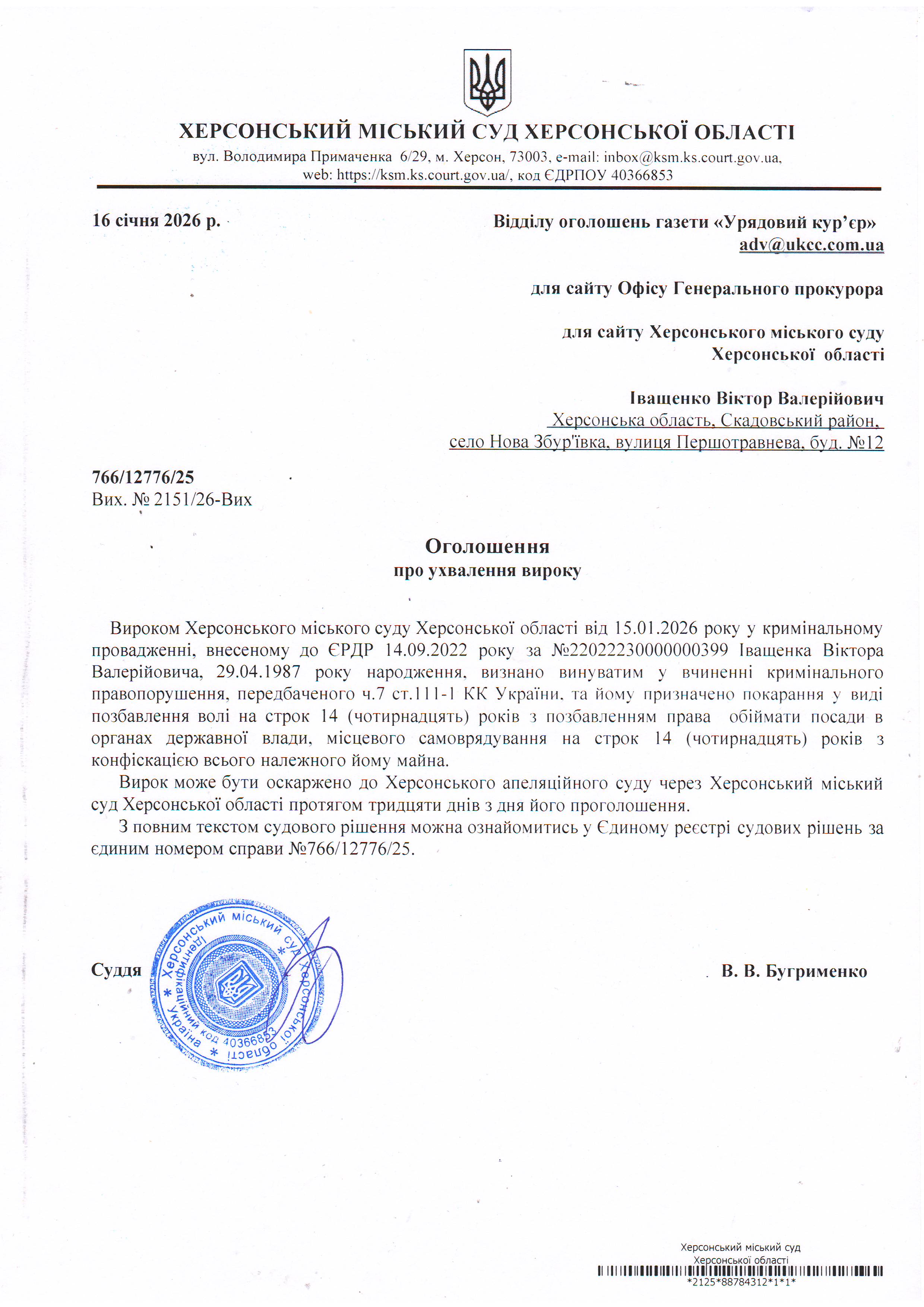 Оголошення для Іващенка Віктора Валерійовича про ухвалення вироку