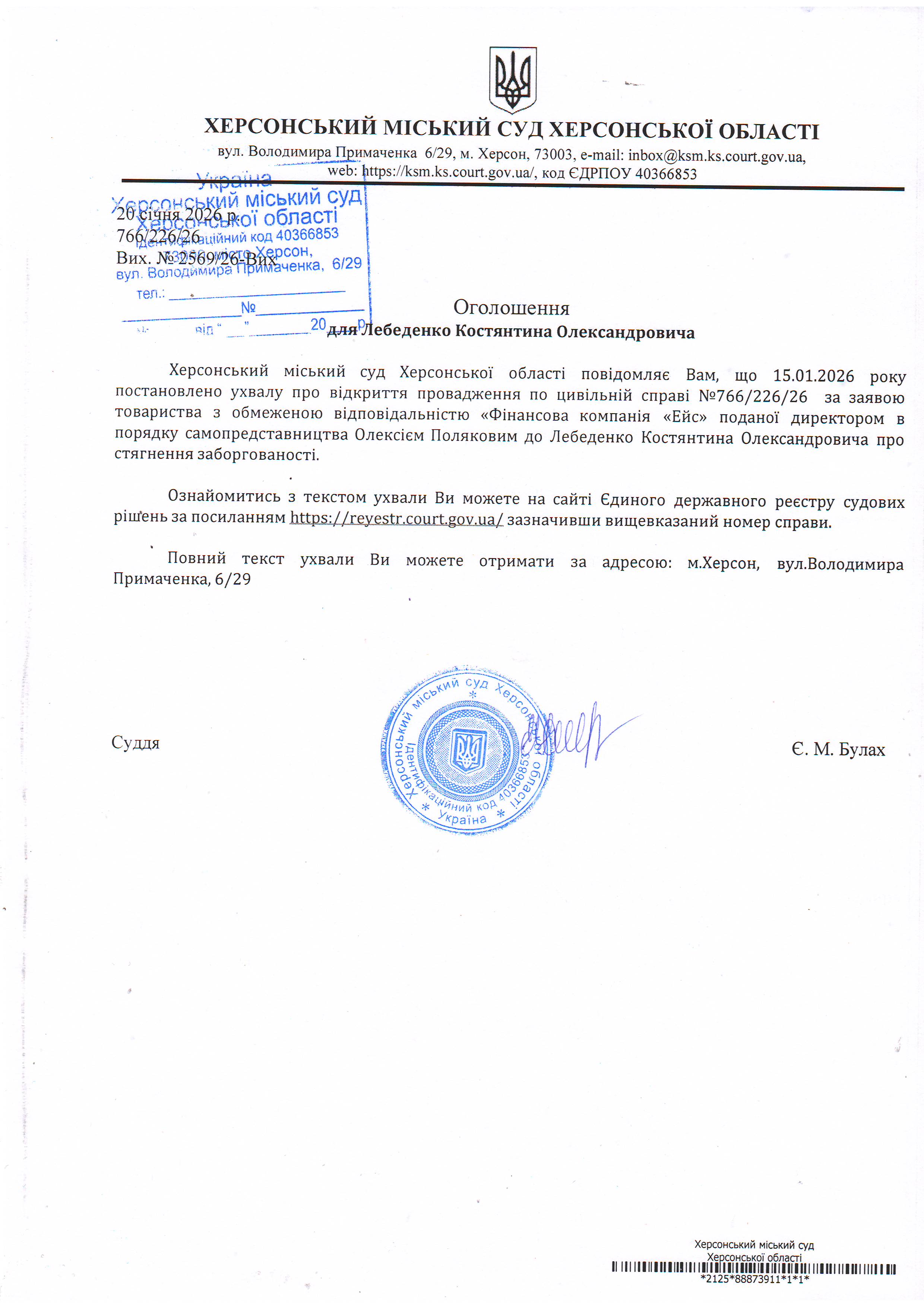 Оголошення для Лебеденка Костянтина Олександровича про постановлення ухвали