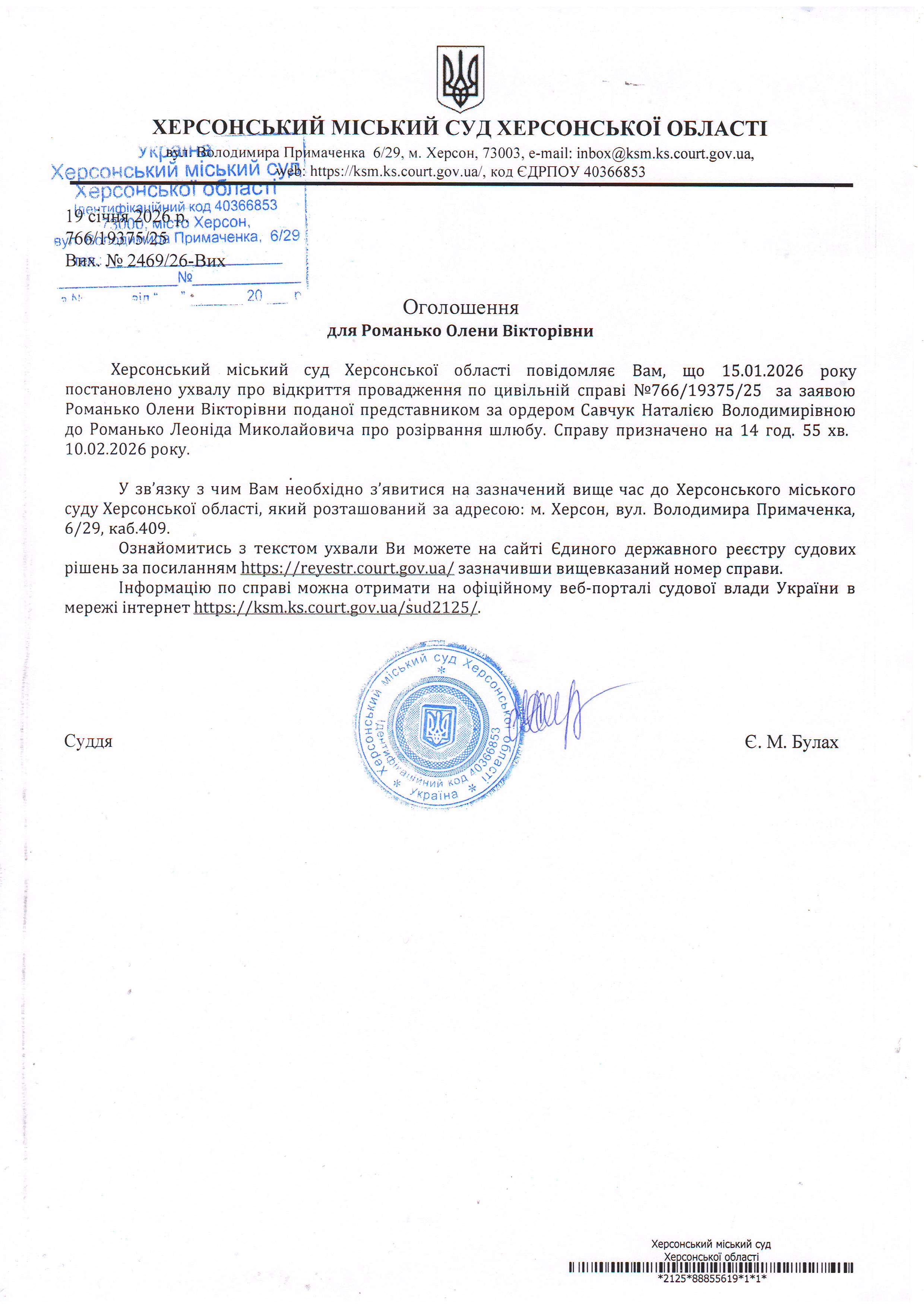 Оголошення для Романько Олени Вікторівни про постановлення ухвали