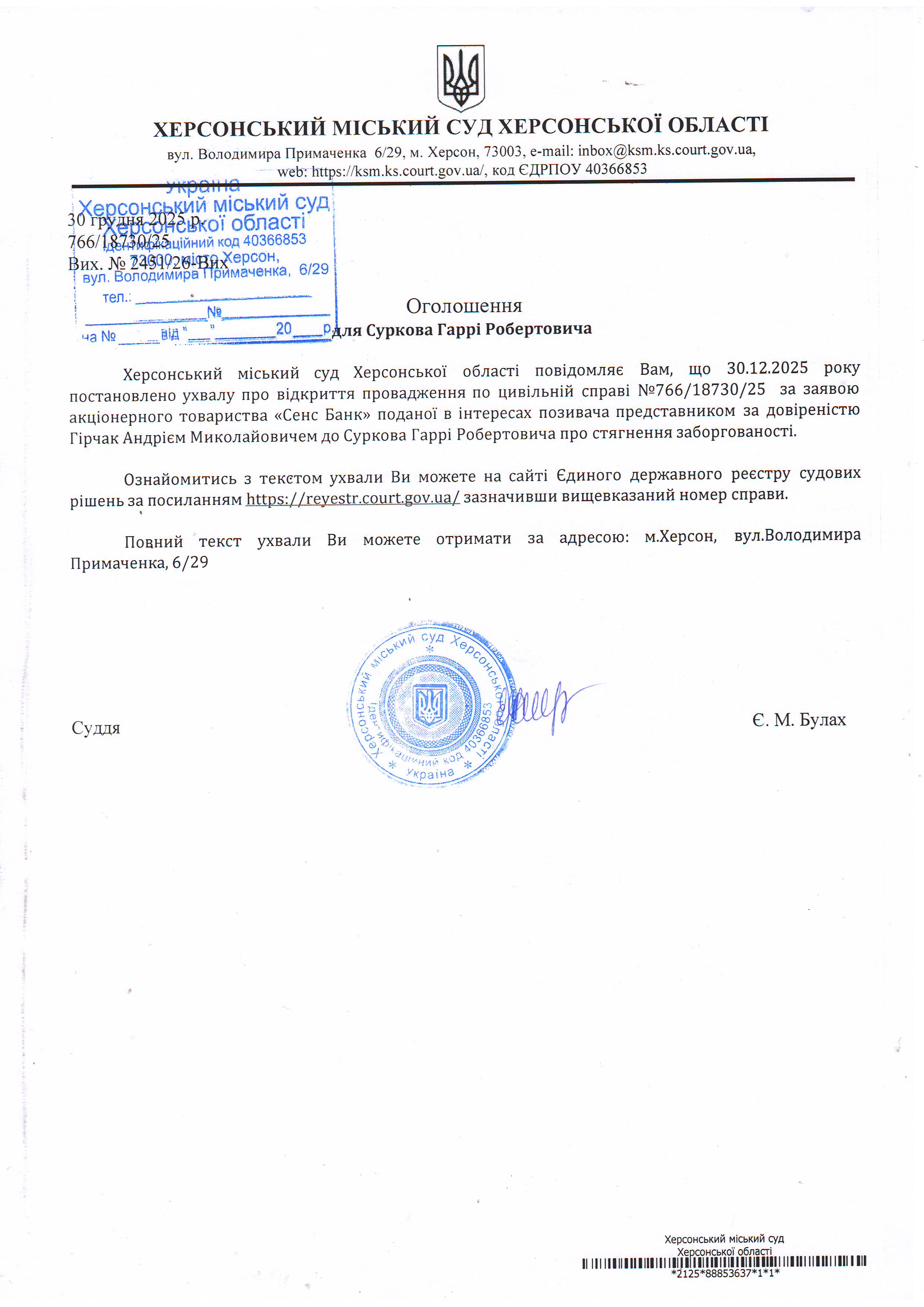 Оголошення для Суркова Гаррі Робертовича про постановлення ухвали