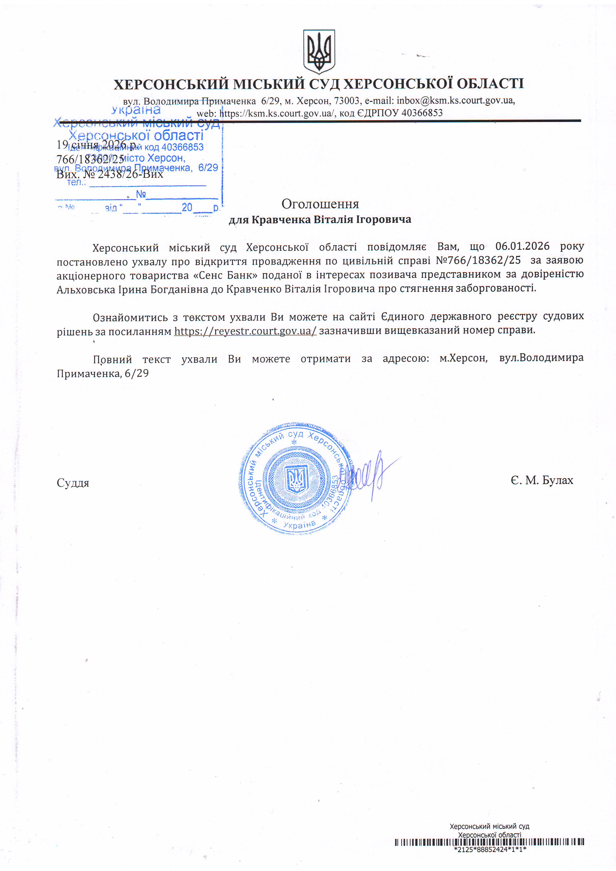 Оголошення для Кравченка Віталія Ігоровича про постановлення ухвали