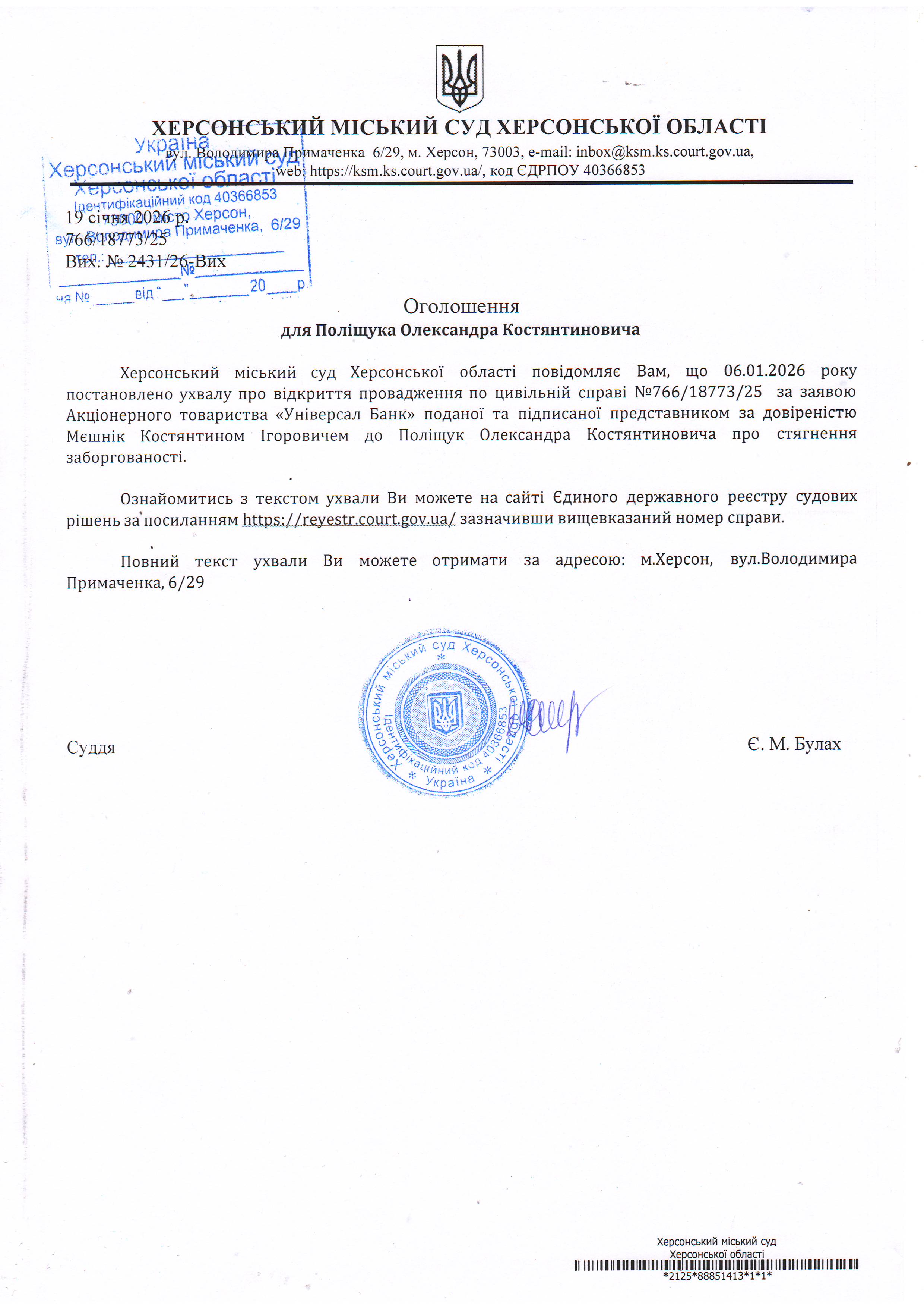 Оголошення для Поліщука Олександра Костянтиновича про постановлення ухвали