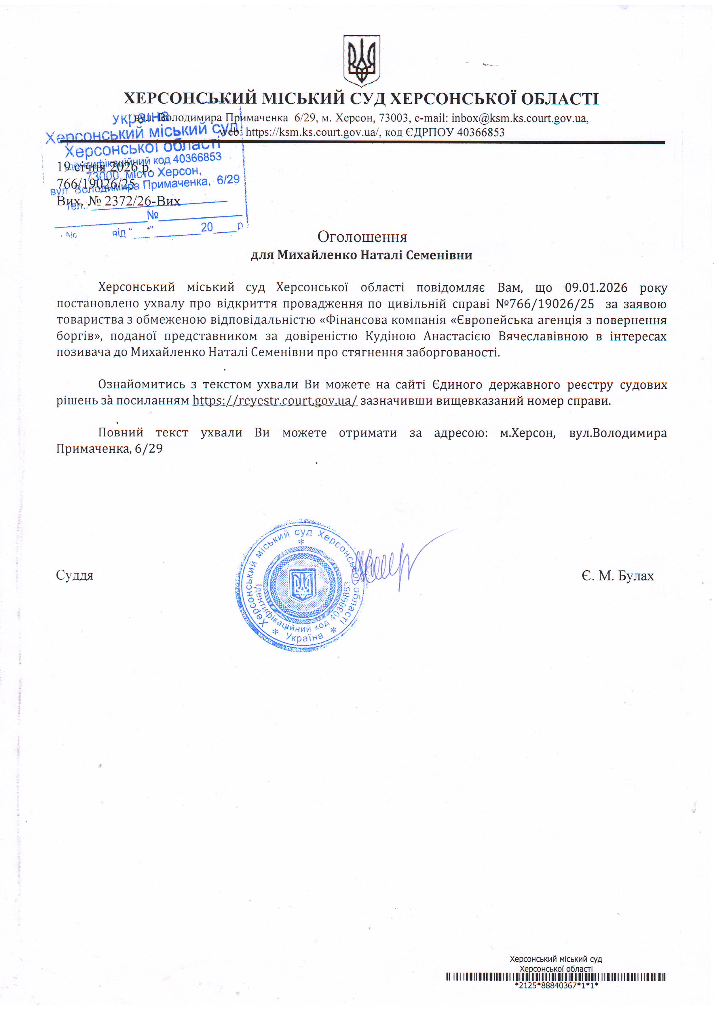 Оголошення для Михайленко Наталі Семенівни про постановлення ухвали
