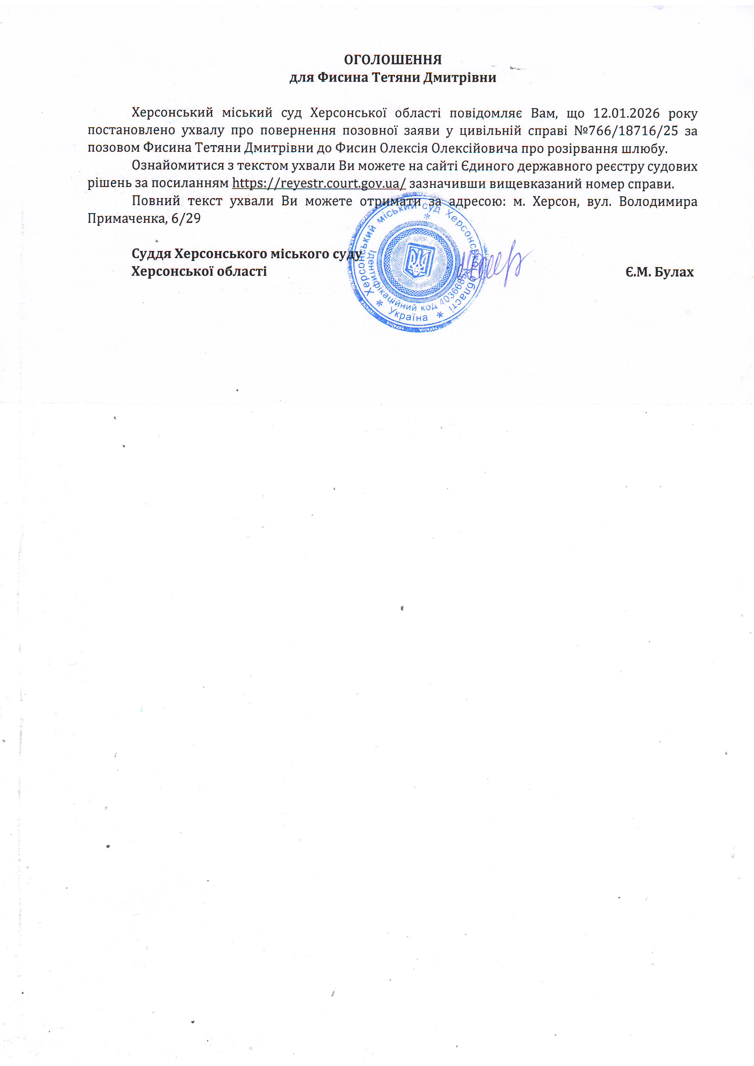 Оголошення для Фисини Тетяни Дмитрівни про постановлення ухвали