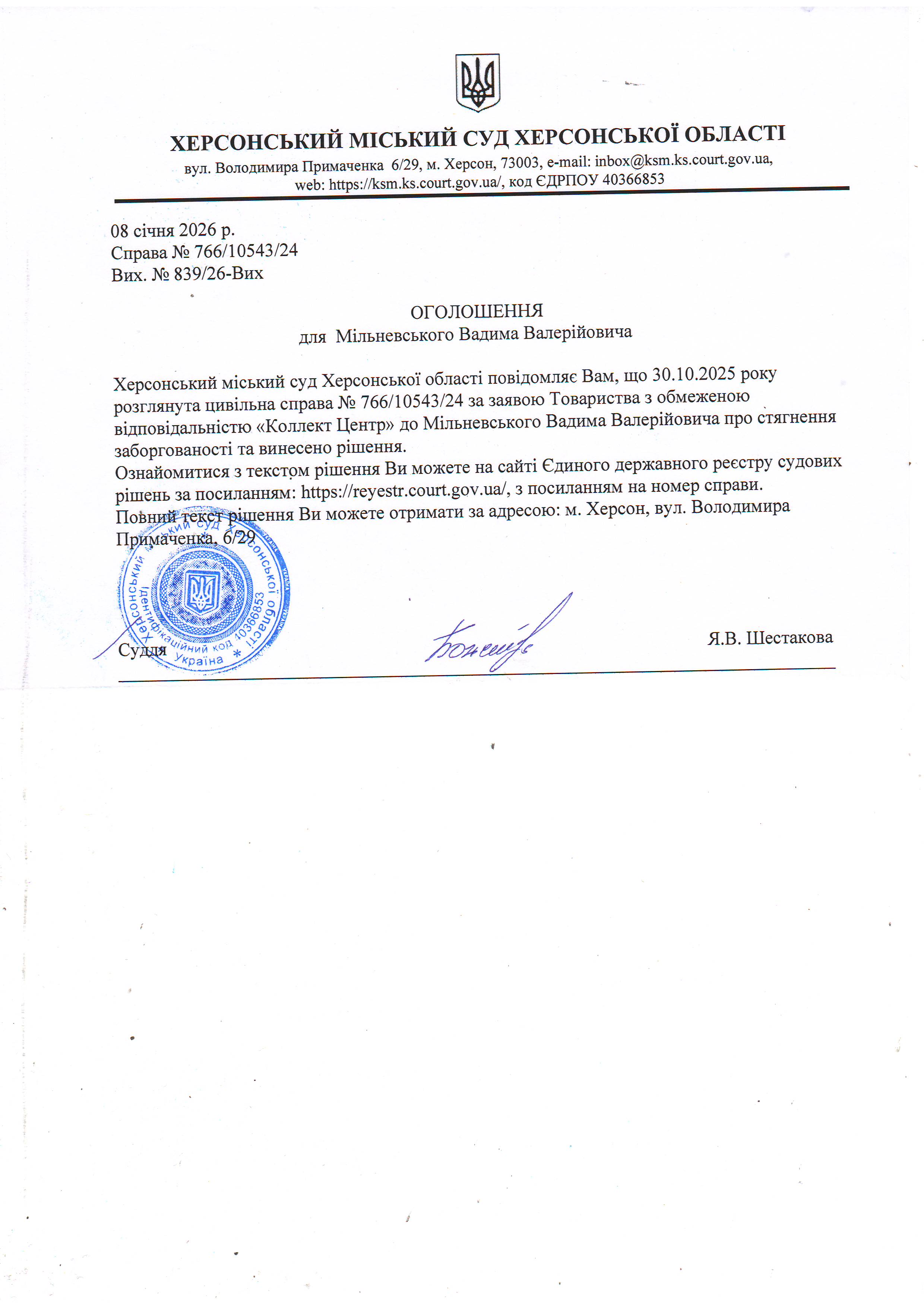 Оголошення для Мільневського Вадима Валерійовича про винесення рішення