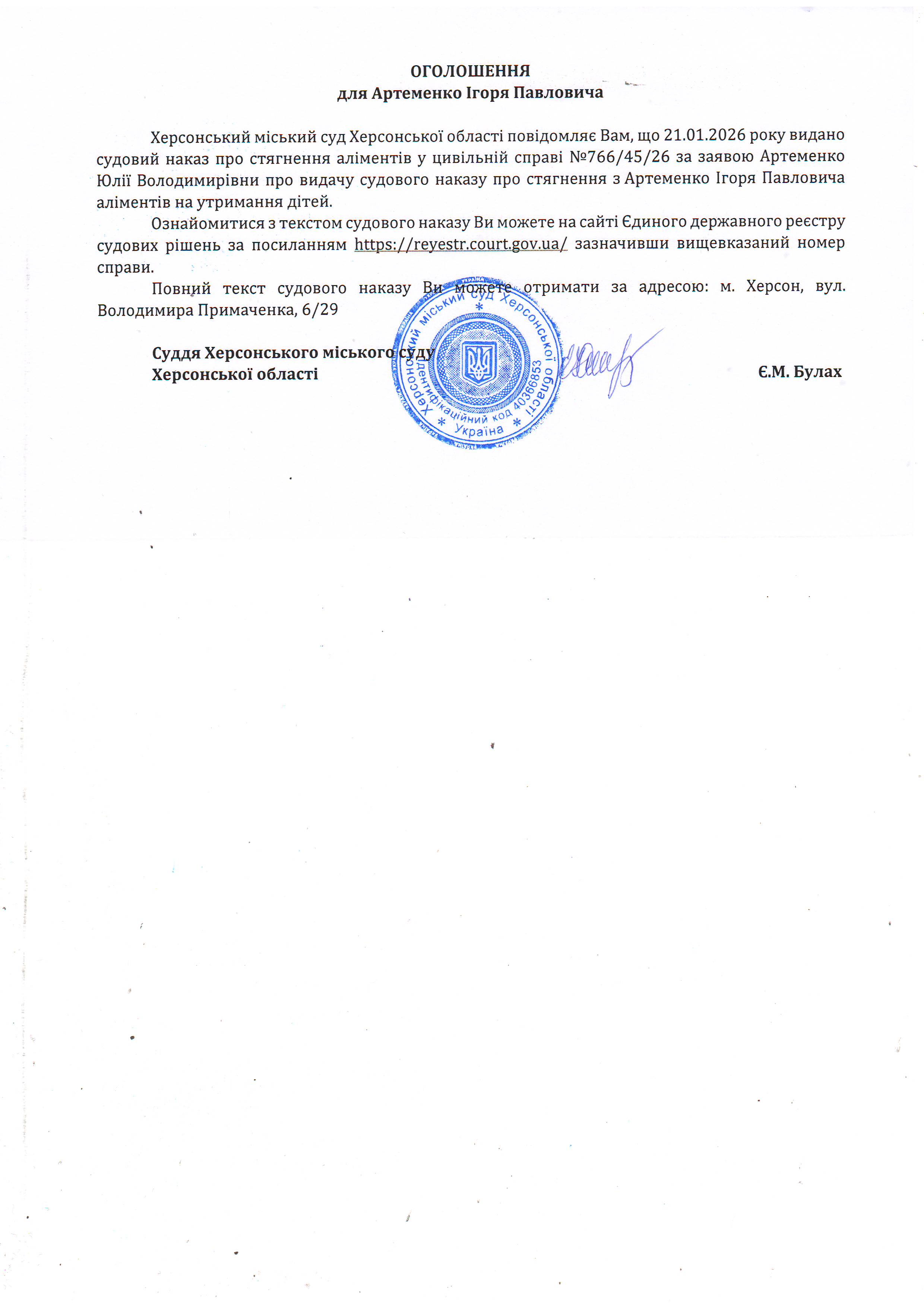 Оголошення для Артеменка Ігоря Павловича про видачу судового наказу