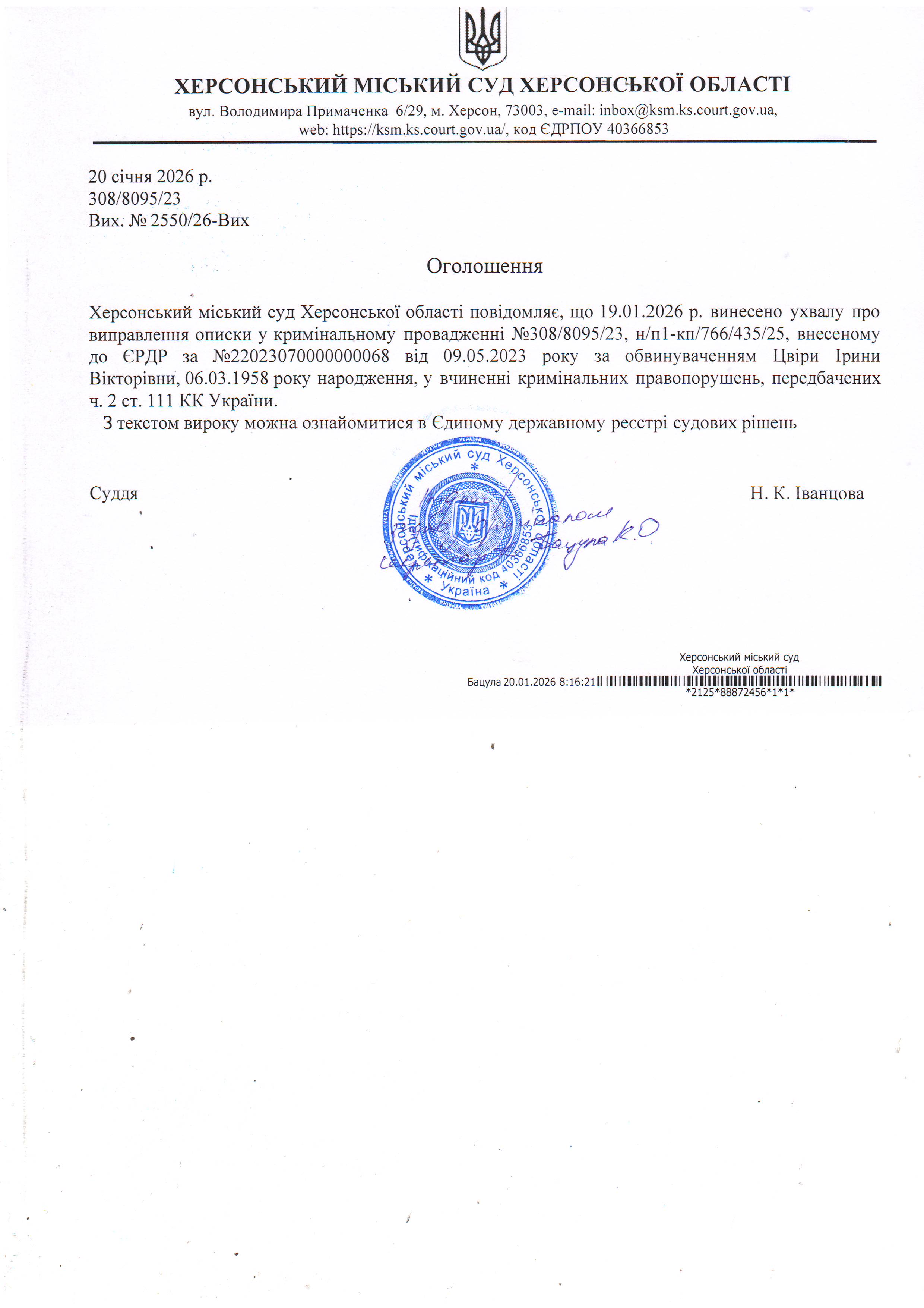 Оголошення для Цвіри Ірини Вікторівни про винесення ухвали