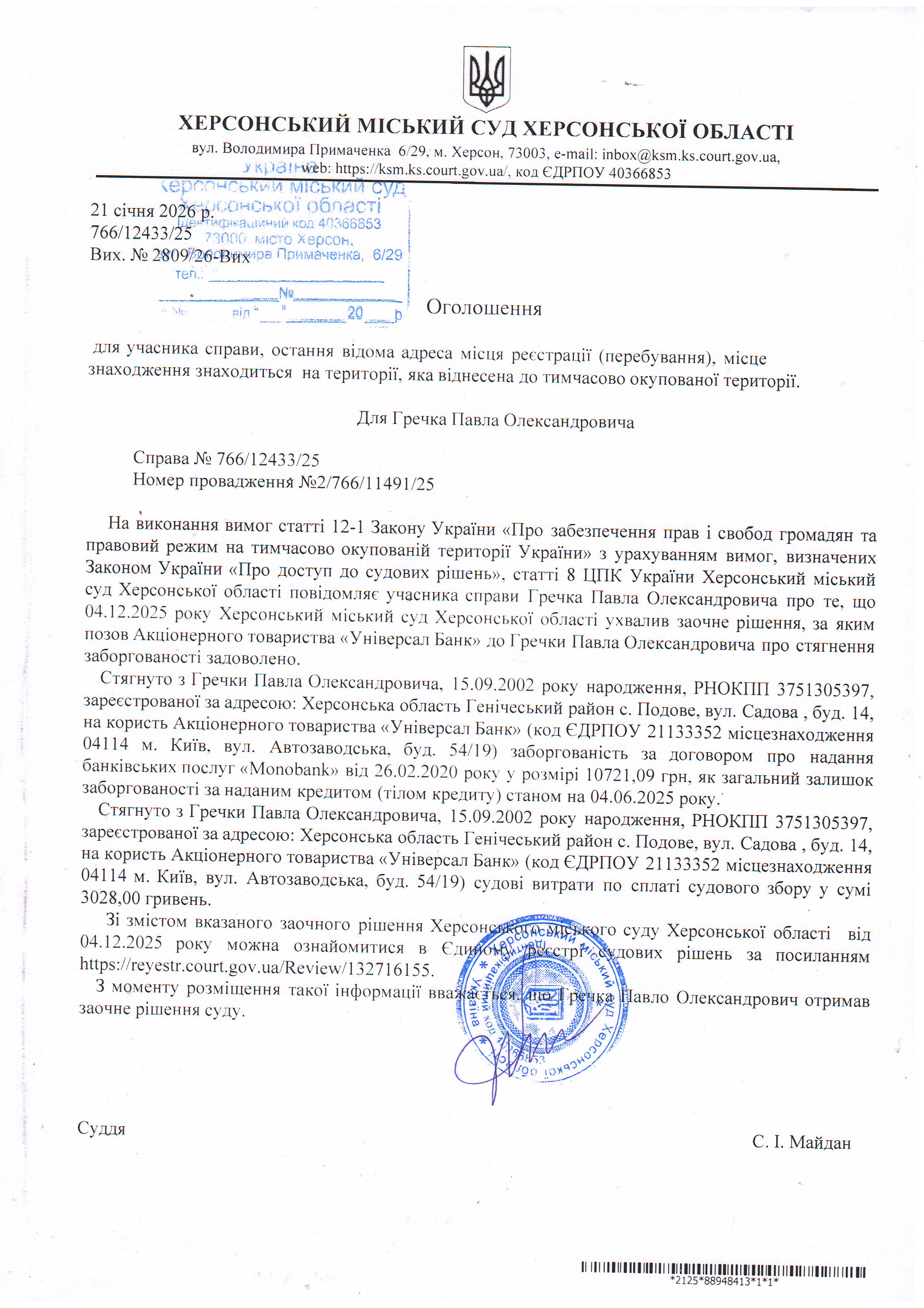 Оголошення для Гречки Павла Олександровича про ухвалення заочного рішення