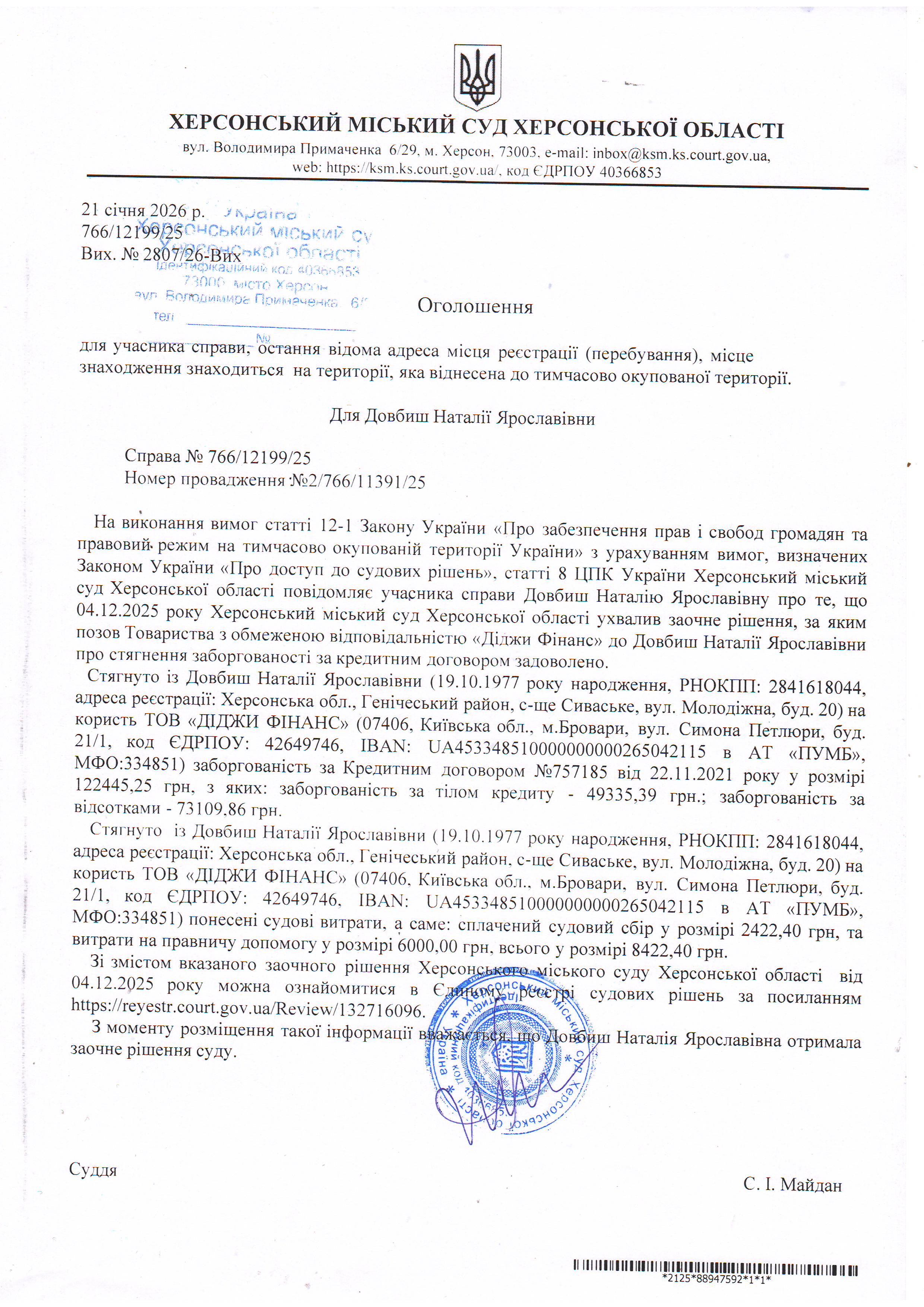 Оголошення для Довбиш Наталії Ярославівни про ухвалення заочного рішення