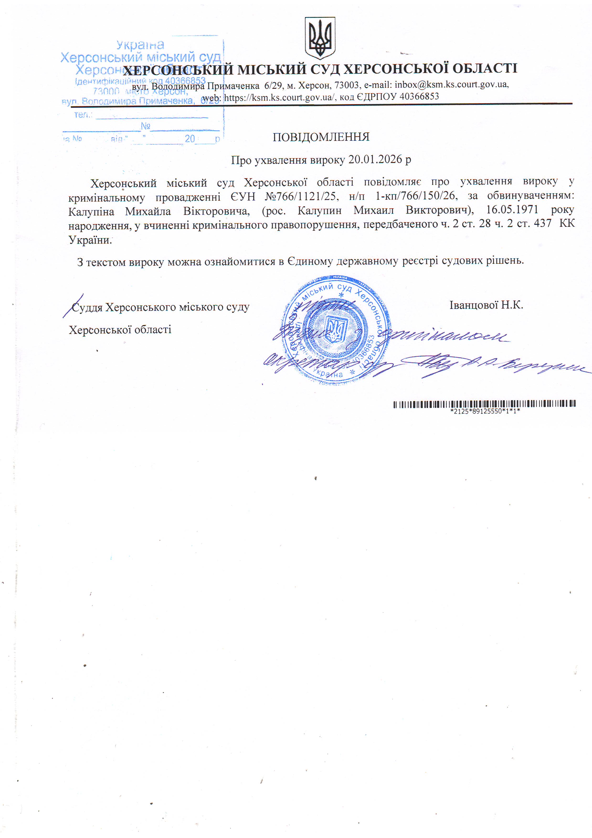 Оголошення для Калупіна Михайла Вікторовича про ухвалення вироку