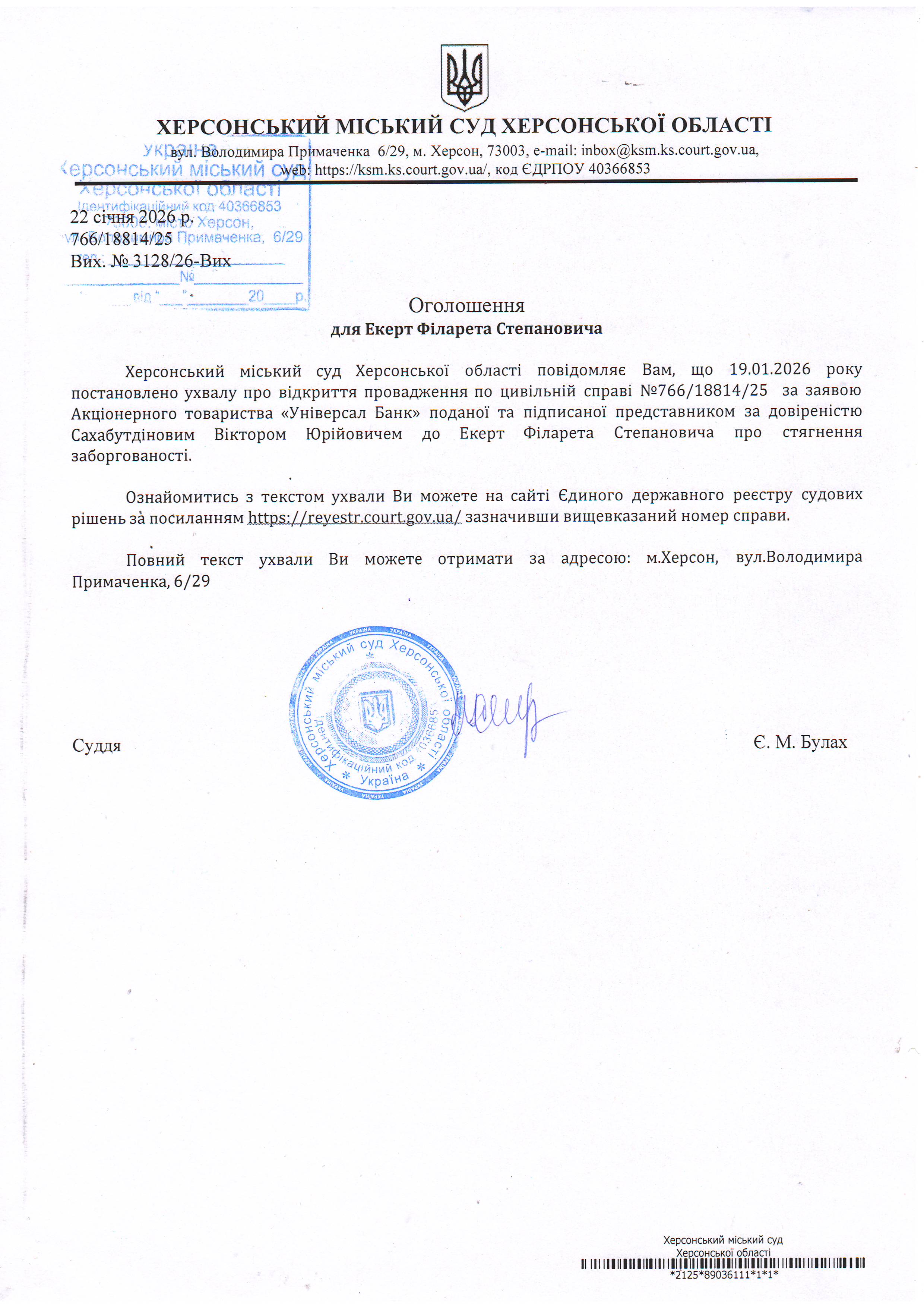 Оголошення для Екерт Філарета Степановича про постановлення ухвали