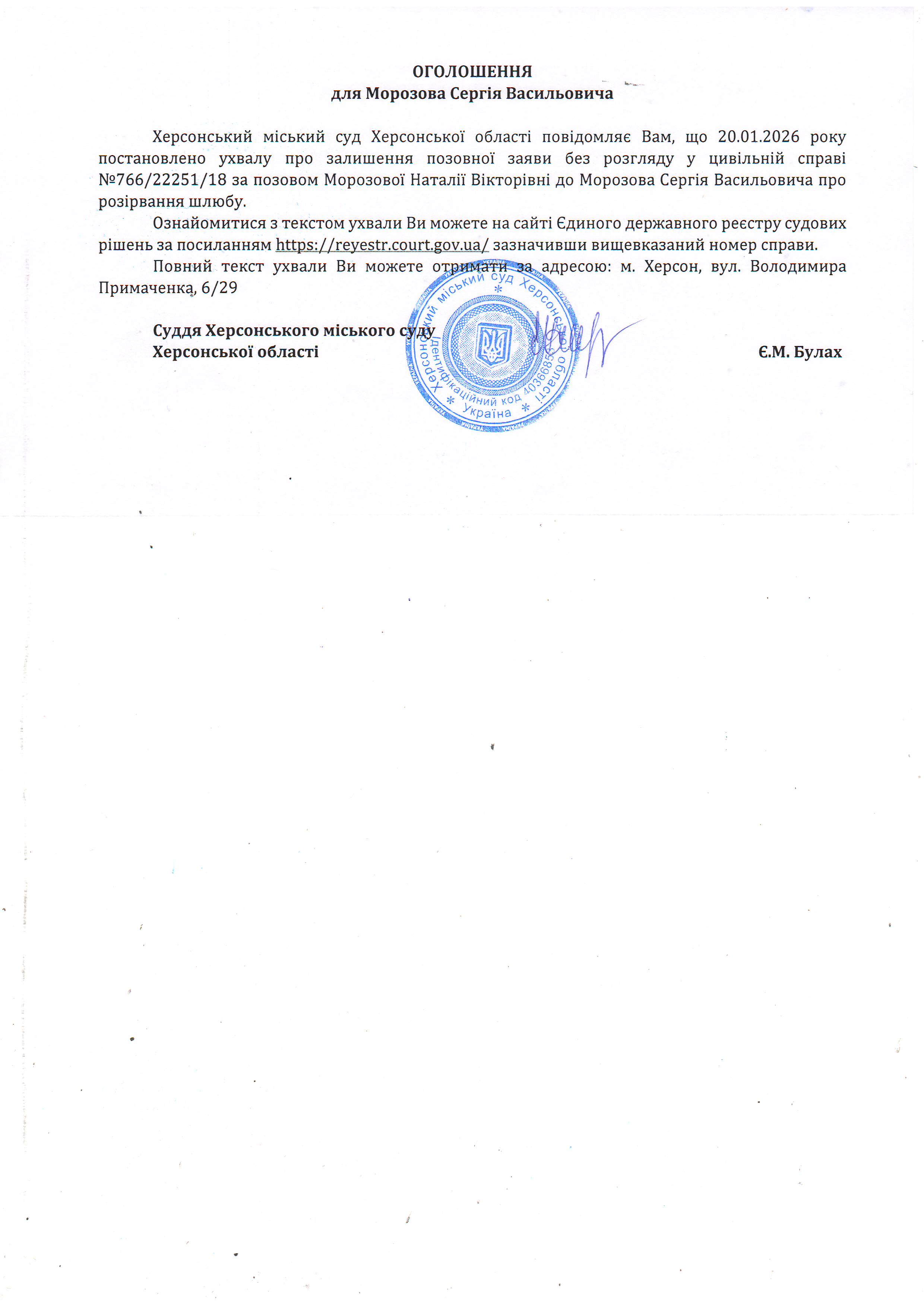 Оголошення для Морозова Сергія Васильовича про постановлення ухвали