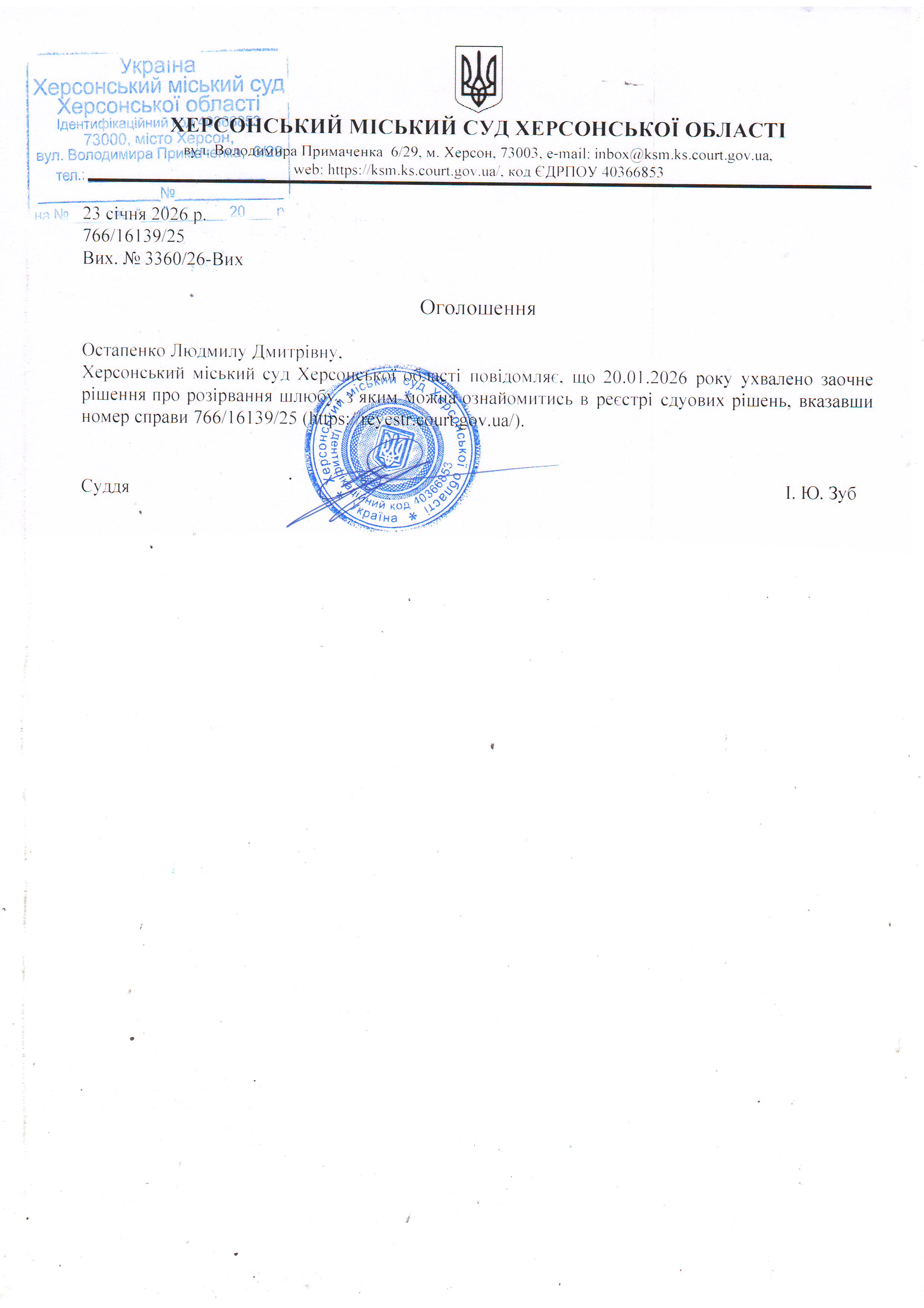 Оголошення для Остапенко Людмили Дмитрівни про ухвалення заочного рішення