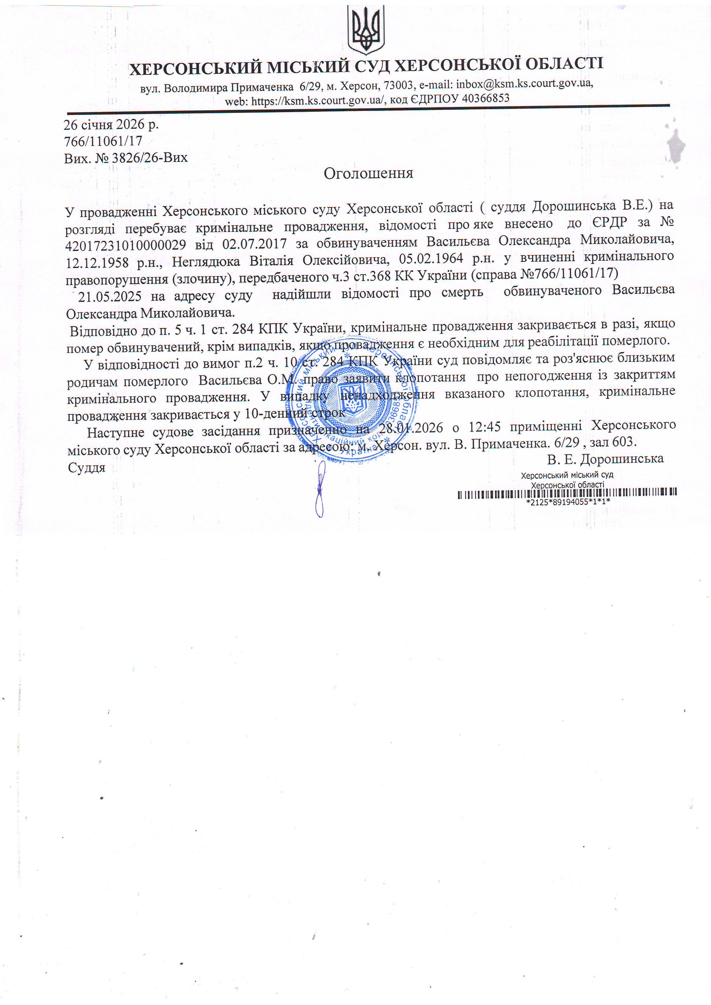 Оголошення про закриття кримінального провадження у відношенні Васильєва Олександра Миколайовича