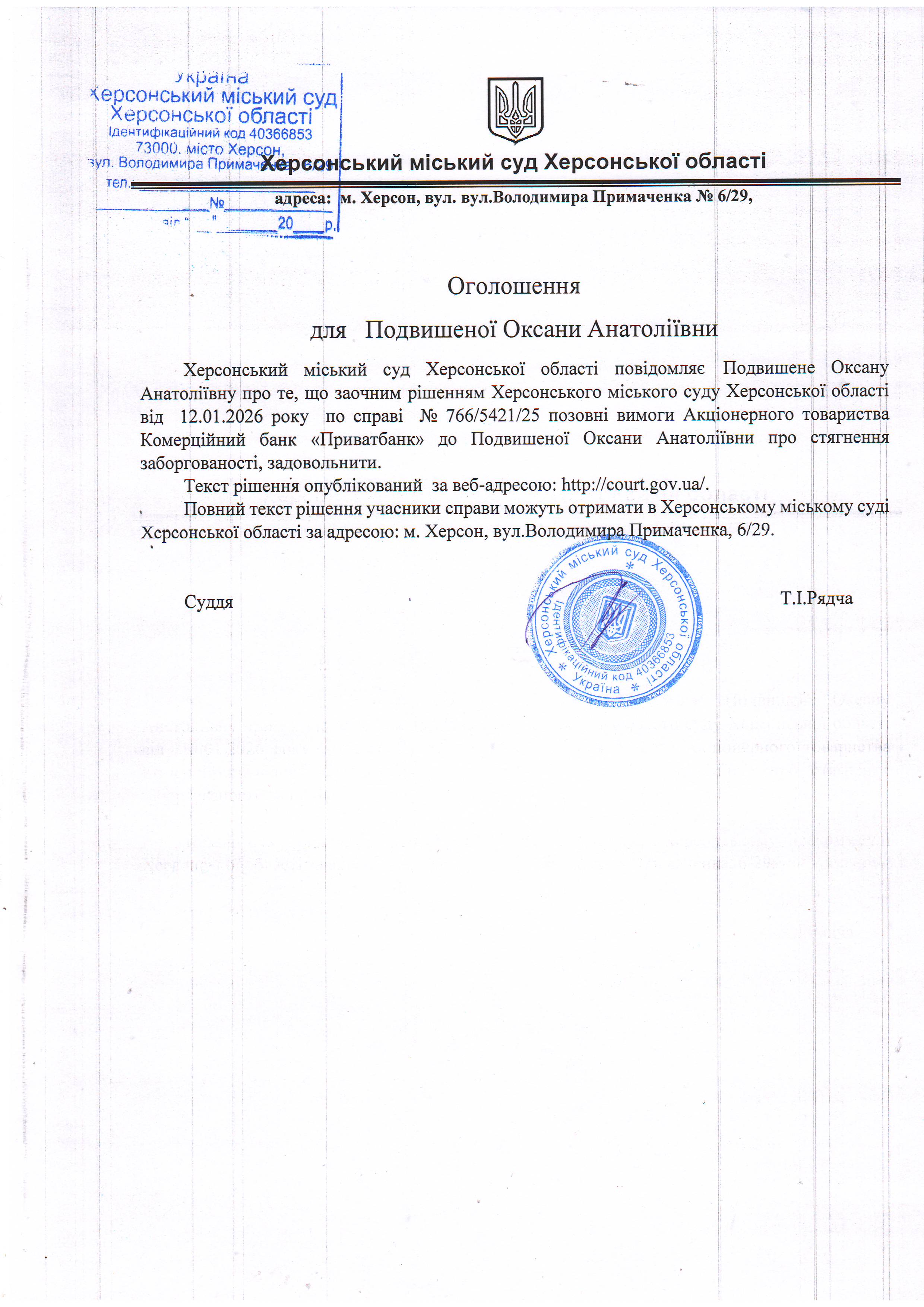 Оголошення для Подвишеної Оксани Анатоліївни