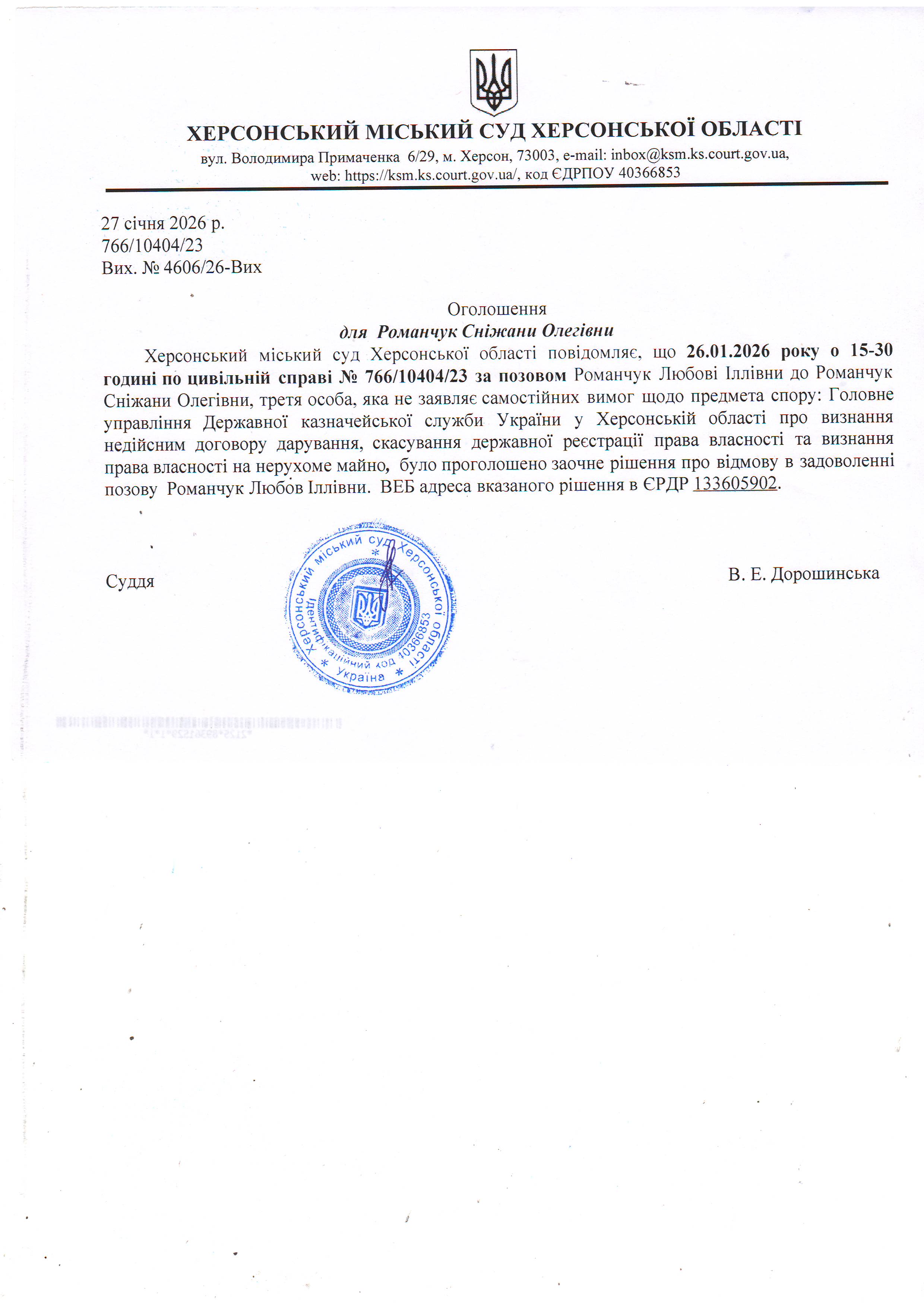 Оголошення для Романчук Сніжани Олегівни про ухвалення заочного рішення