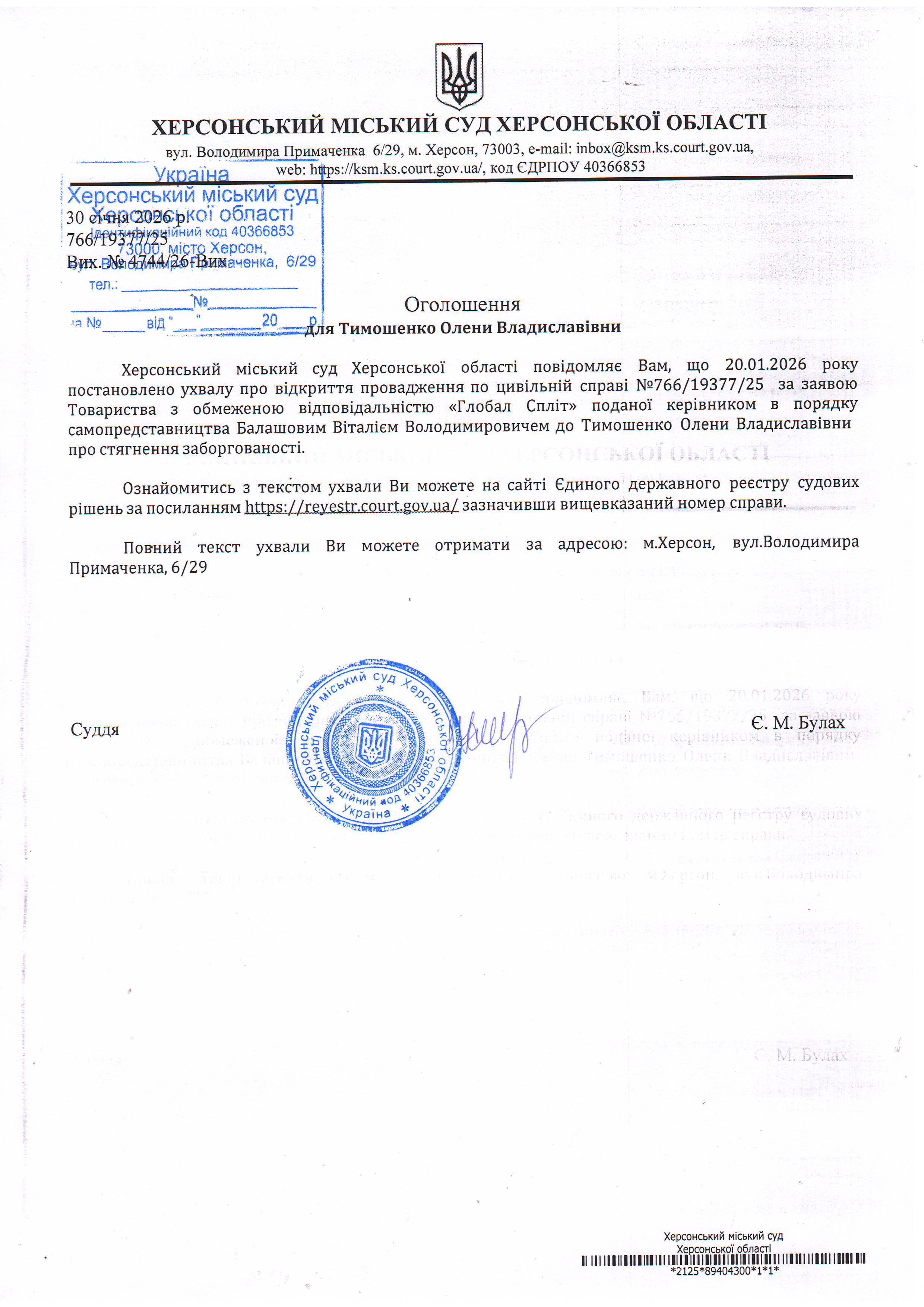 Оголошення для Тимошенко Олени Владиславівни про постановлення ухвали