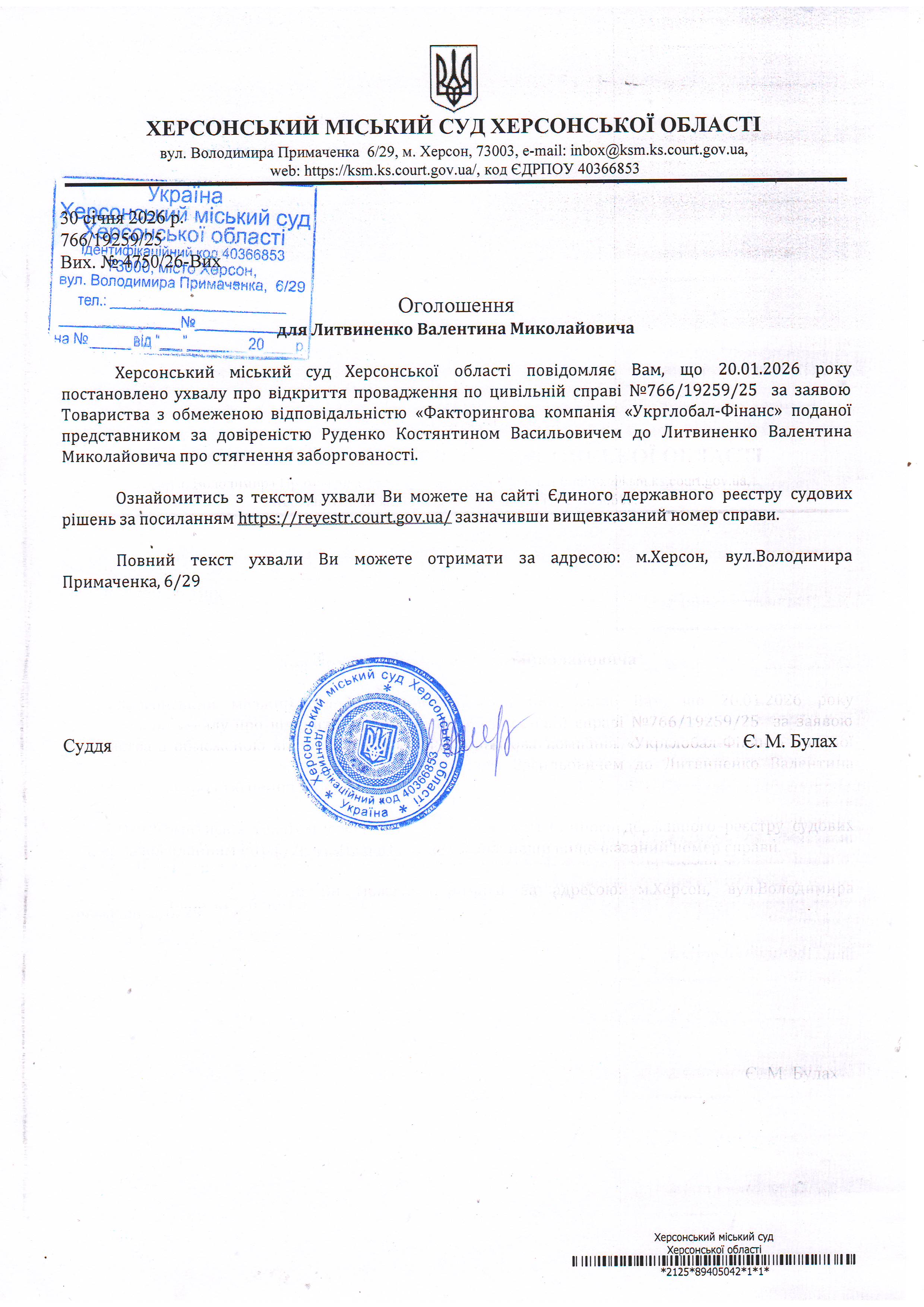 Оголошення для Литвиненка Валентина Миколайовича про постановлення ухвали