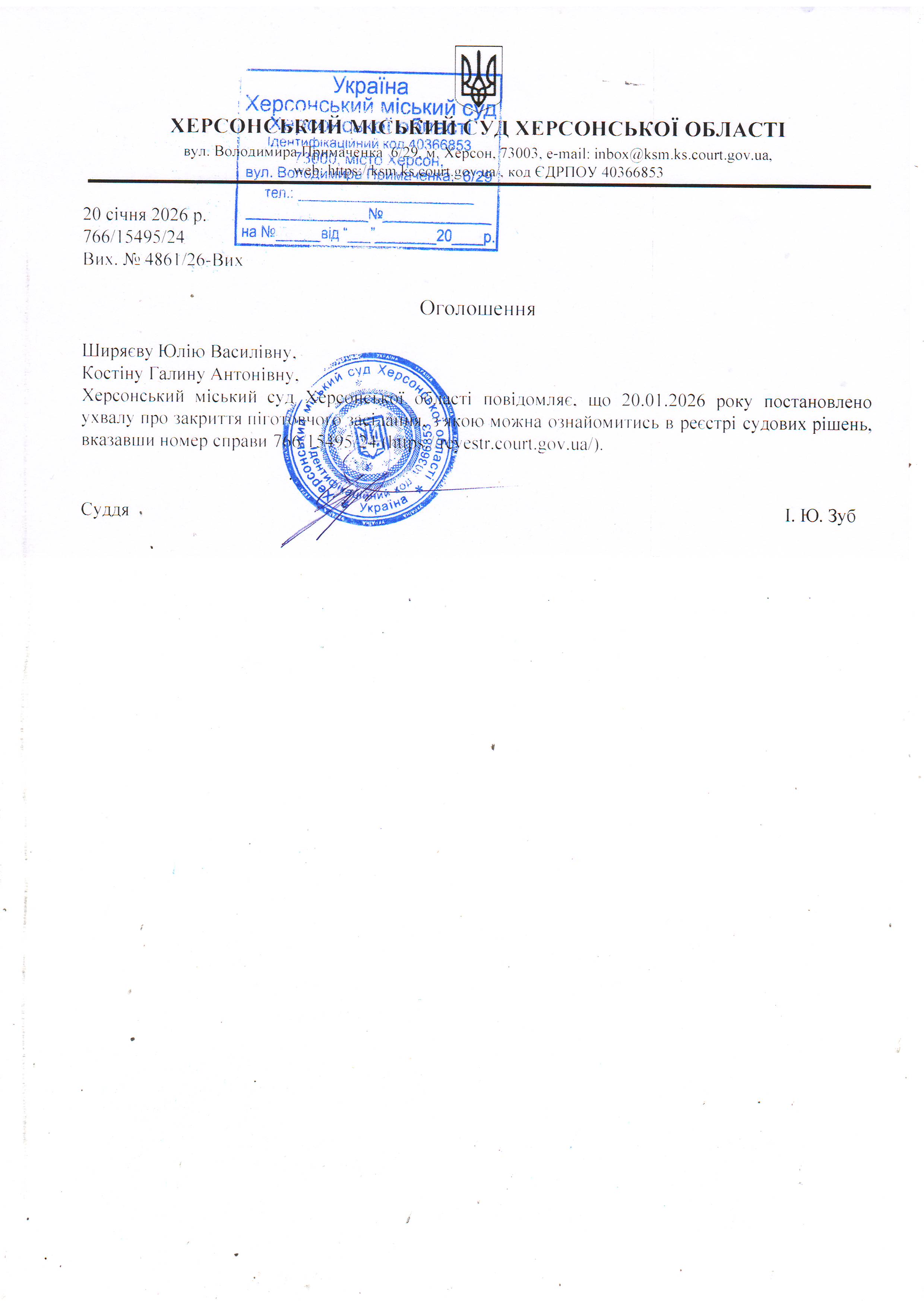 Оголошення для Ширяєвої Юлії Василівни про постановлення ухвали