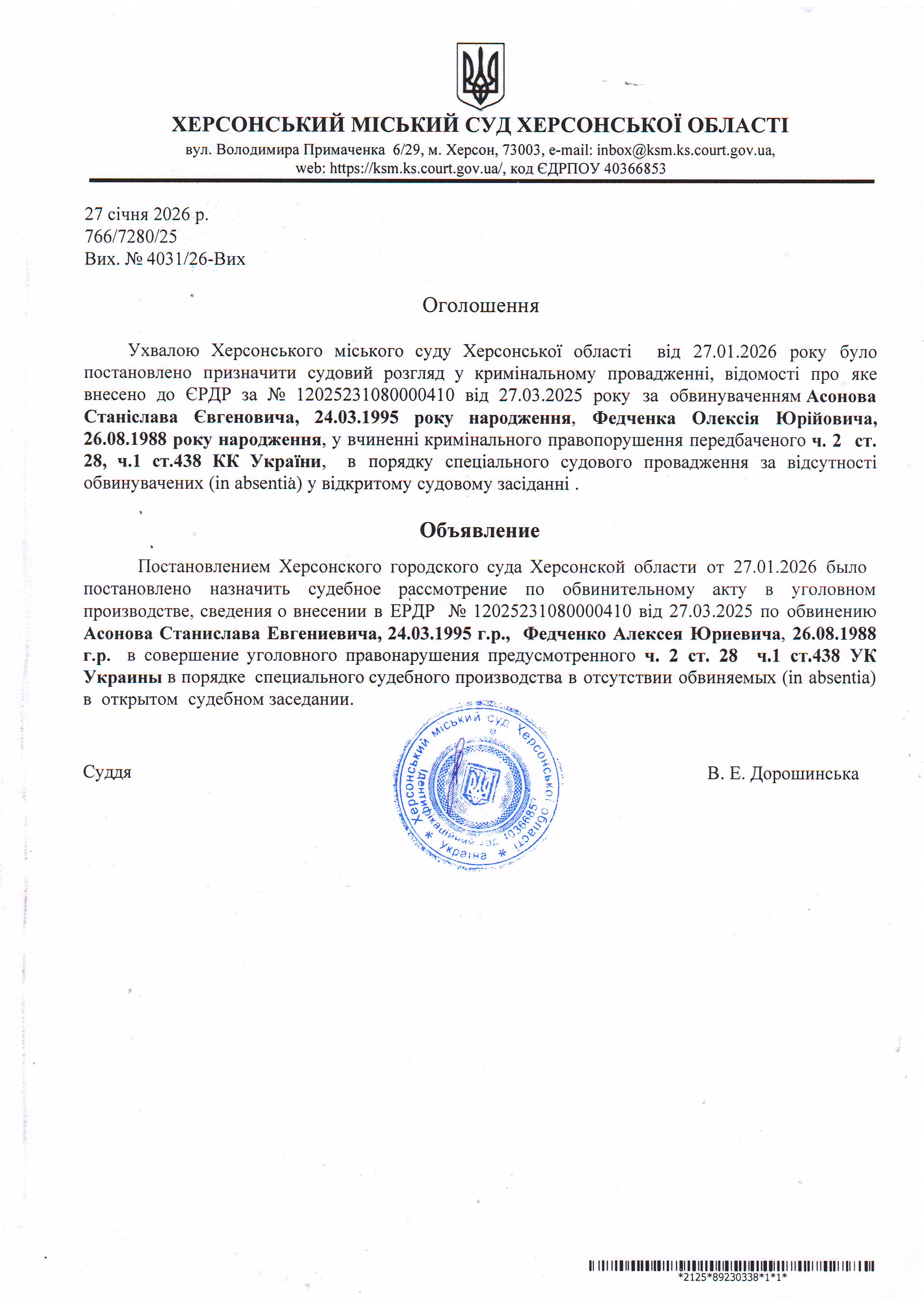 Оголошення для Асонова Станіслава Євгеновича, Федченка Олексія Юрійовича