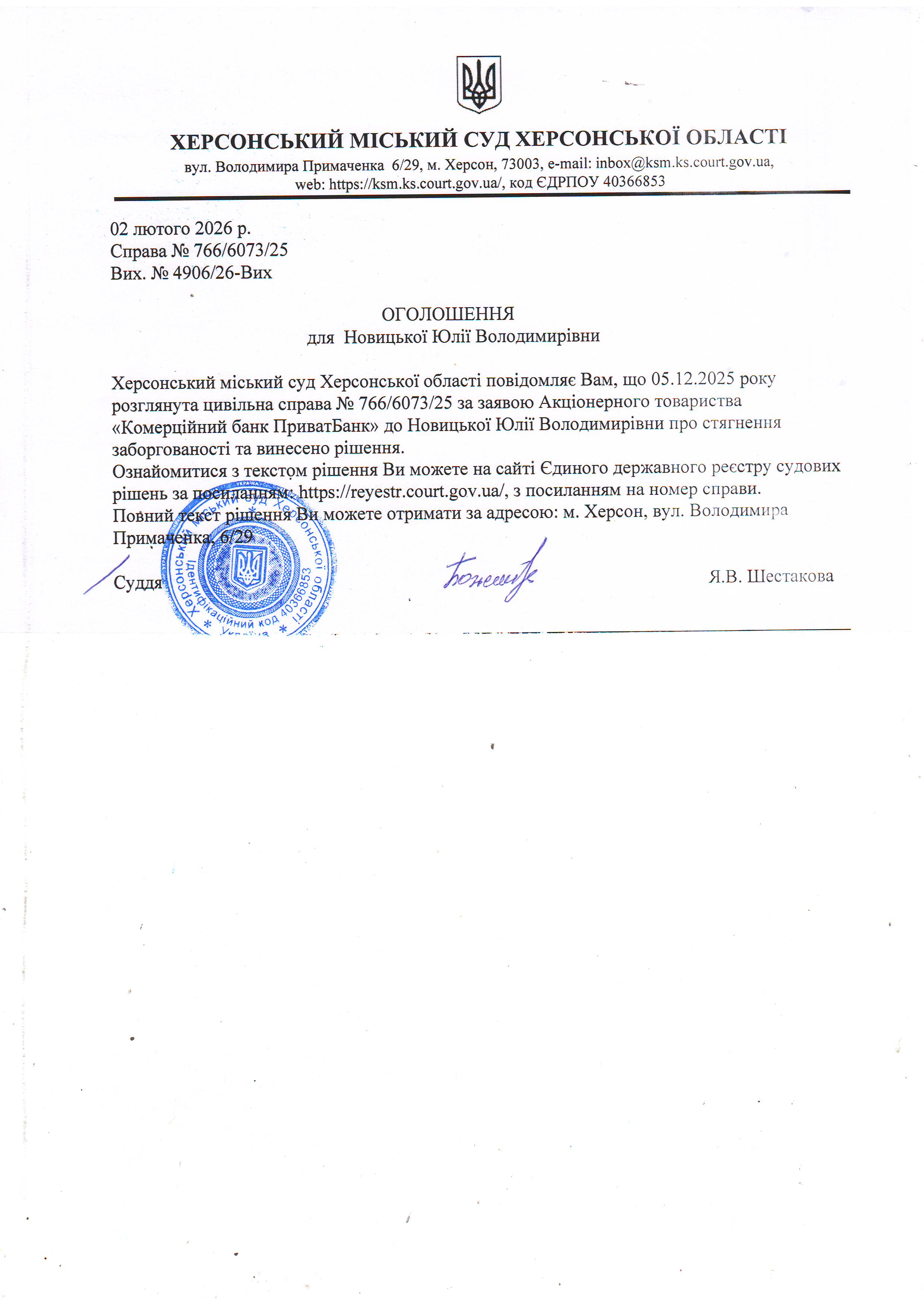 Оголошення для Новицької Юлії Володимирівни про винесення рішення