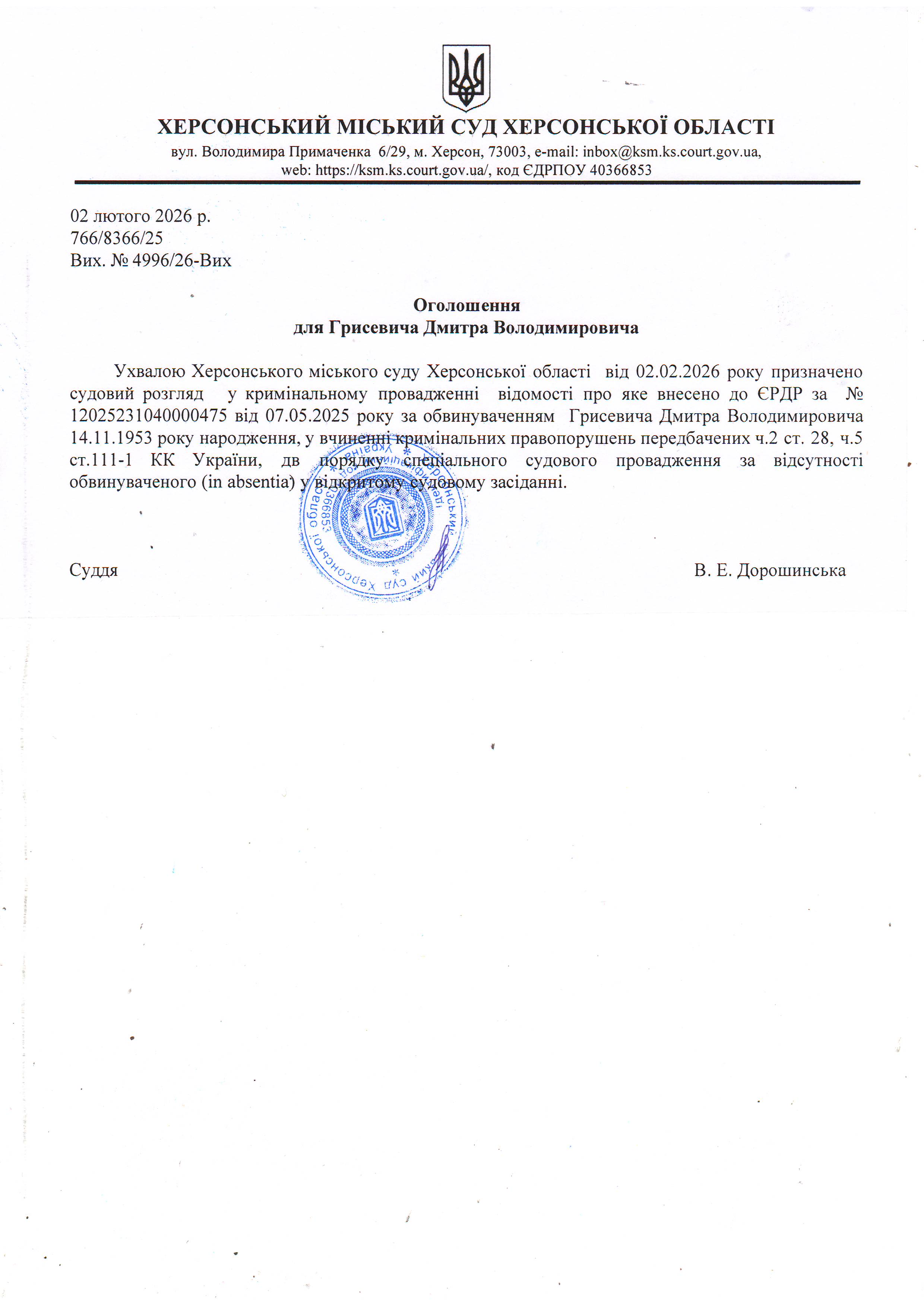 Оголошення для Грисевича Дмитра Володимировича