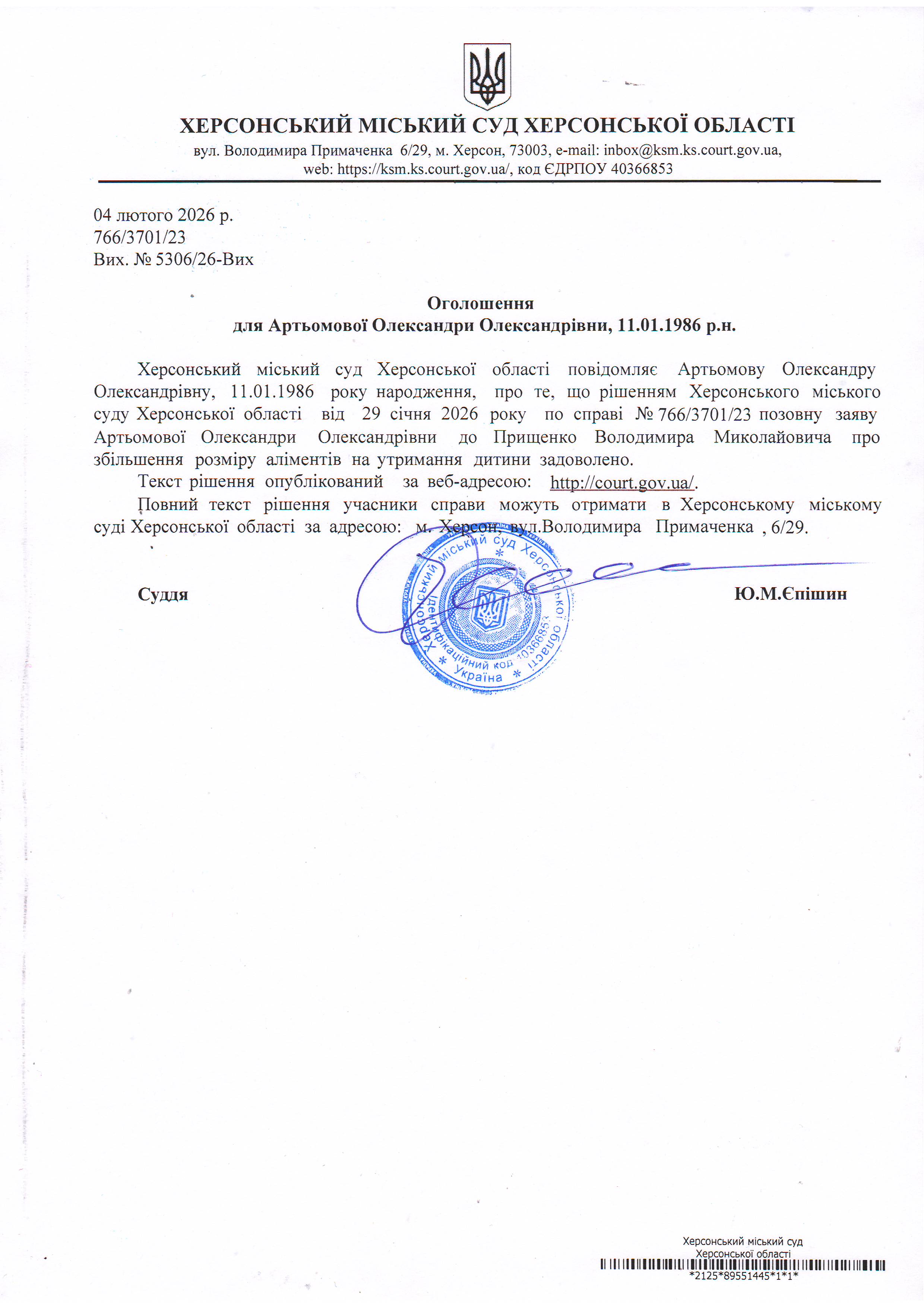 Оголошення про виклик особи в суд та повідомлення про судове рішення