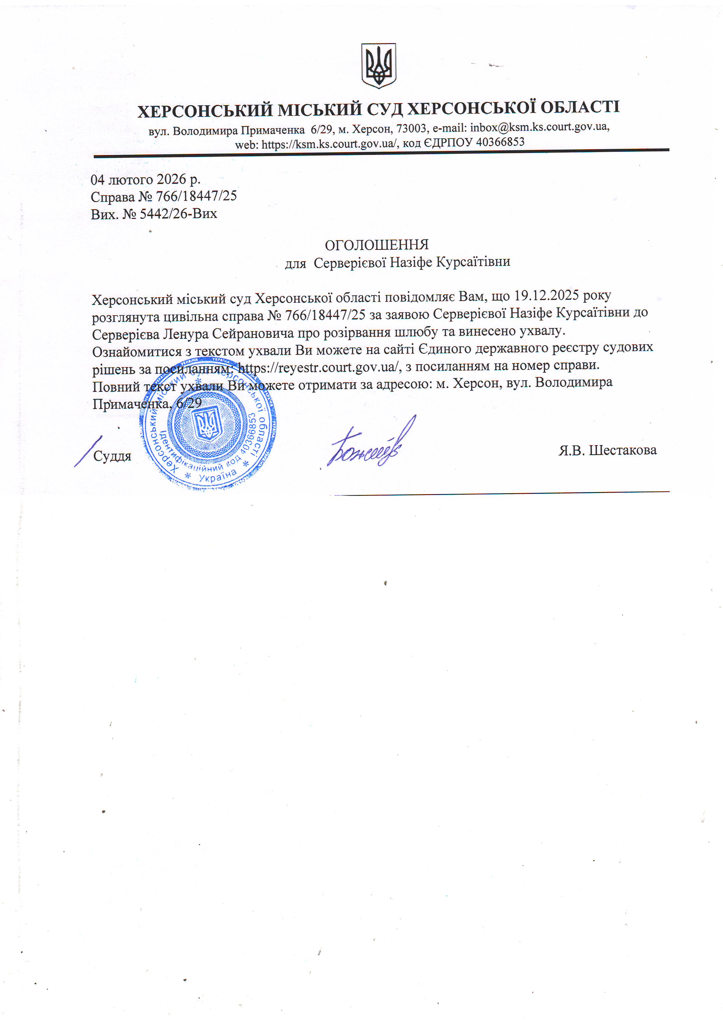 Оголошення для Серверієвої Назіфе Курсаїтівни про винесення ухвали