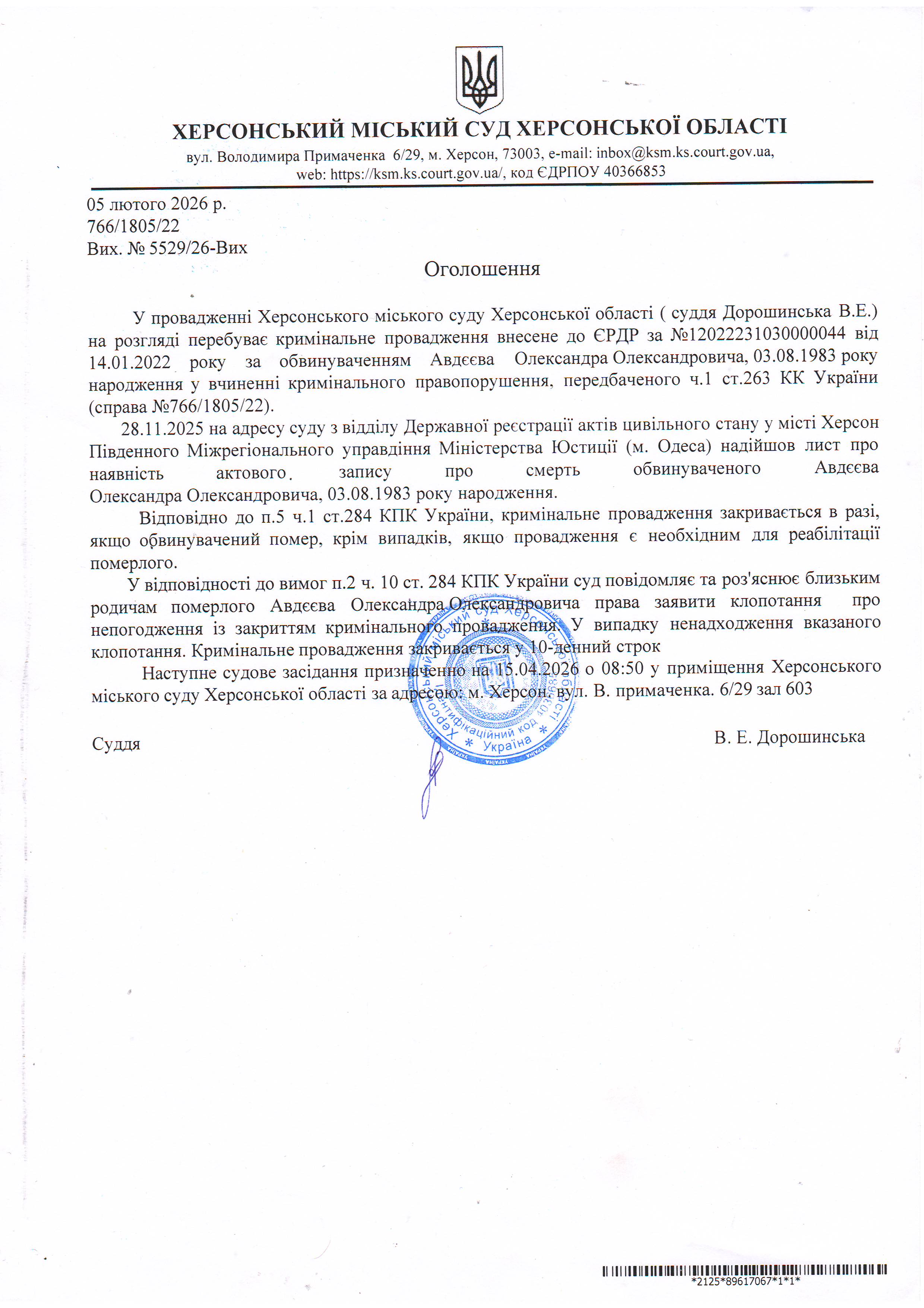 Оголошення про закриття кримінального провадження у відношенні Авдєєва Олександра Олександровича