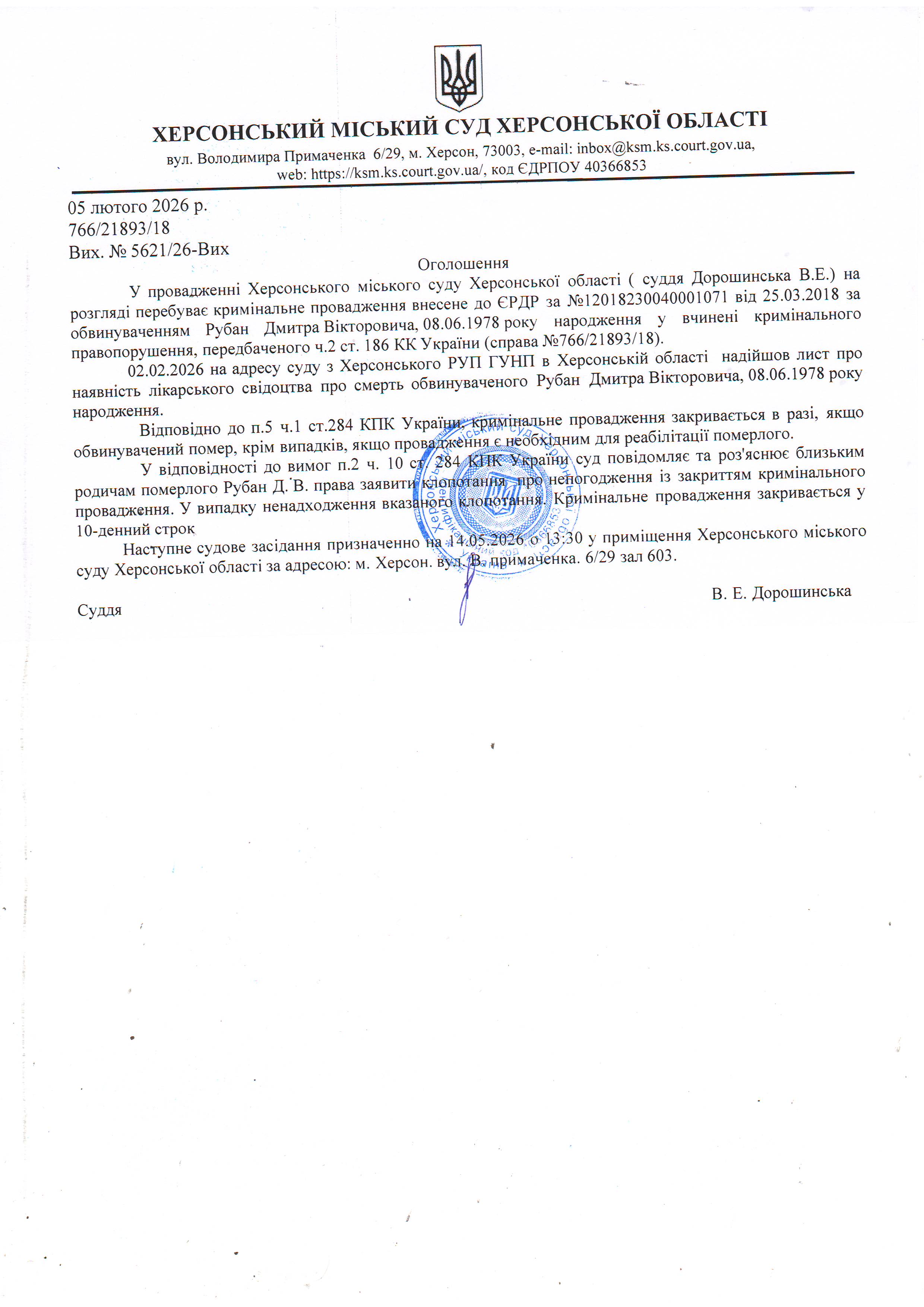 Оголошення про закриття кримінального провадження у відношенні Рубана Дмитра Вікторовича