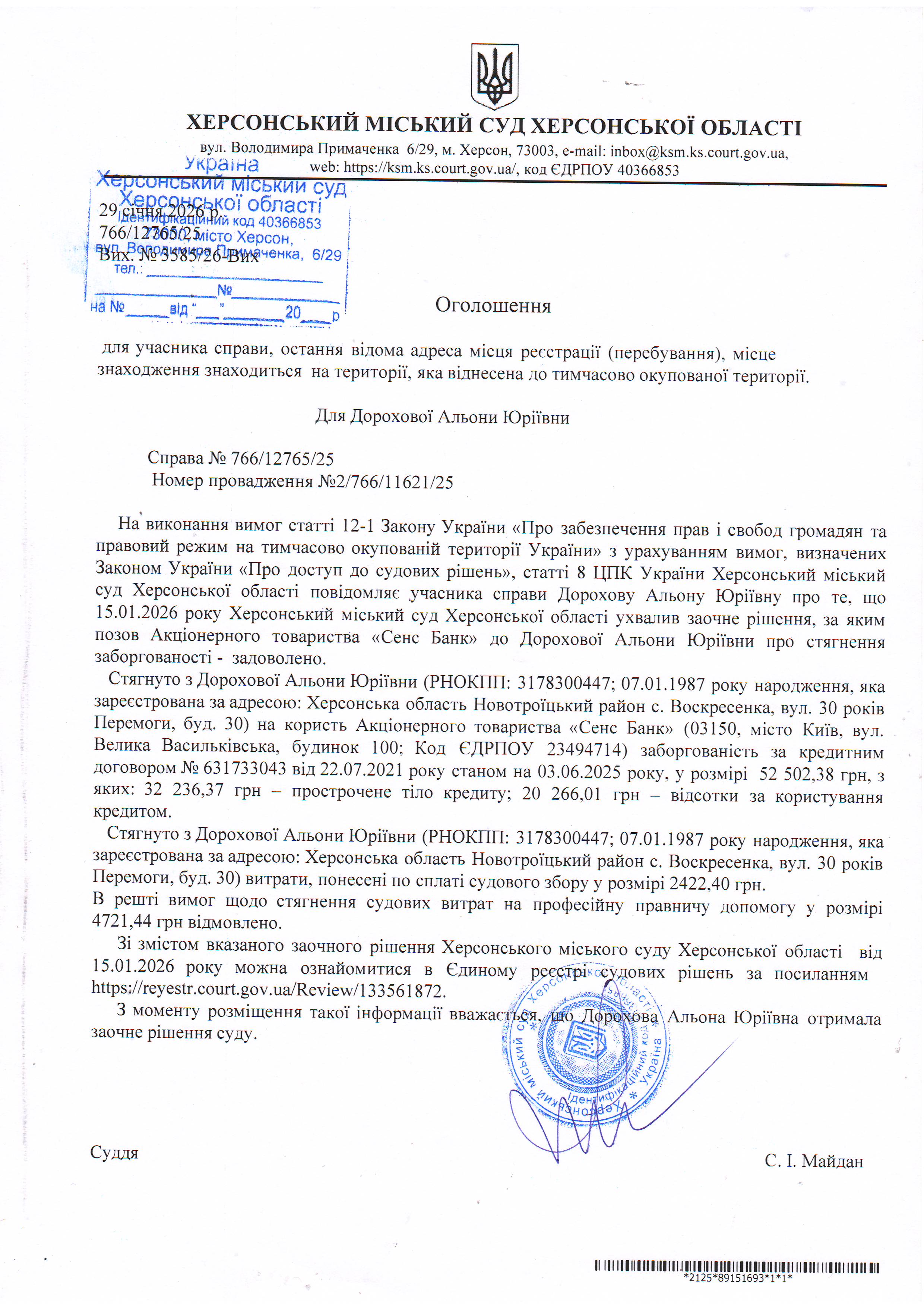 Оголошення для Дорохової Альони Юріївни про ухвалення заочного рішення