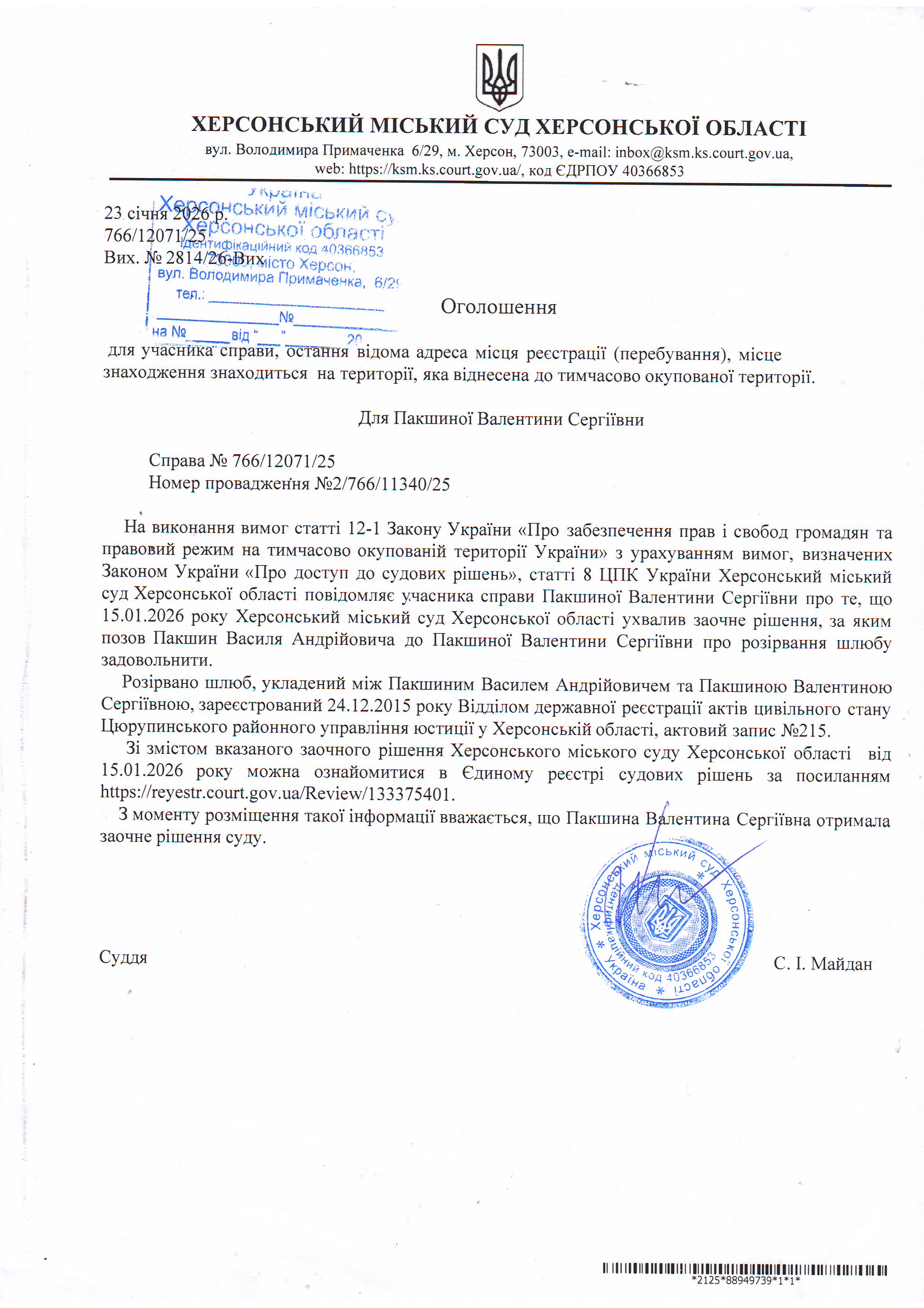 Оголошення для Пакшиної Валентини Сергіївни про ухвалення заочного рішення