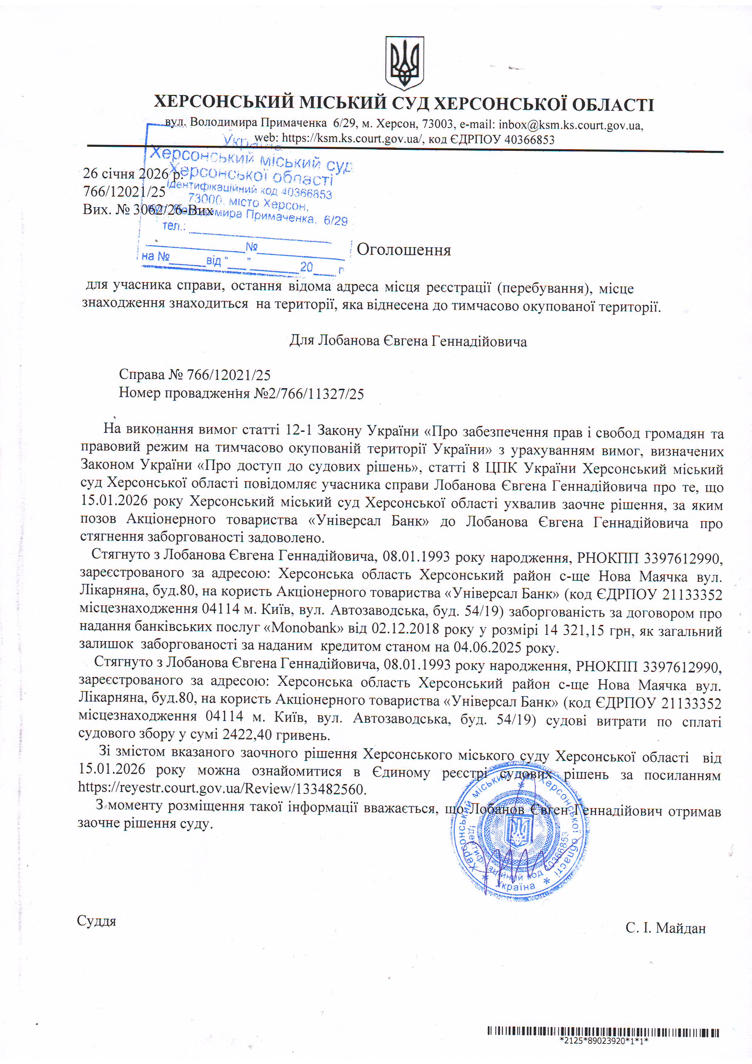 Оголошення для Лобанова Євгена Геннадійовича про ухвалення заочного рішення