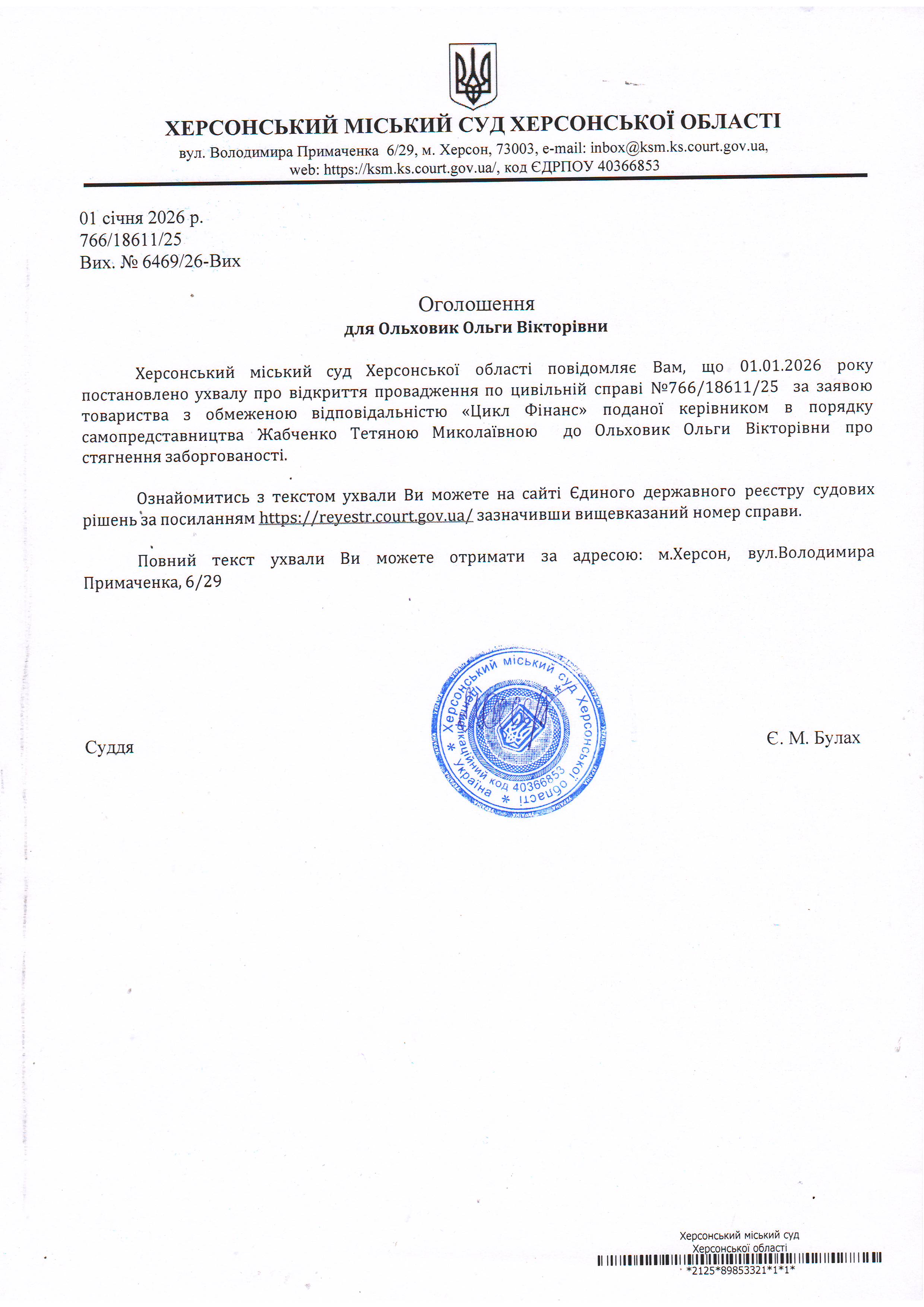 Оголошення для Ольховик Ольги Вікторівни про постановлення ухвали