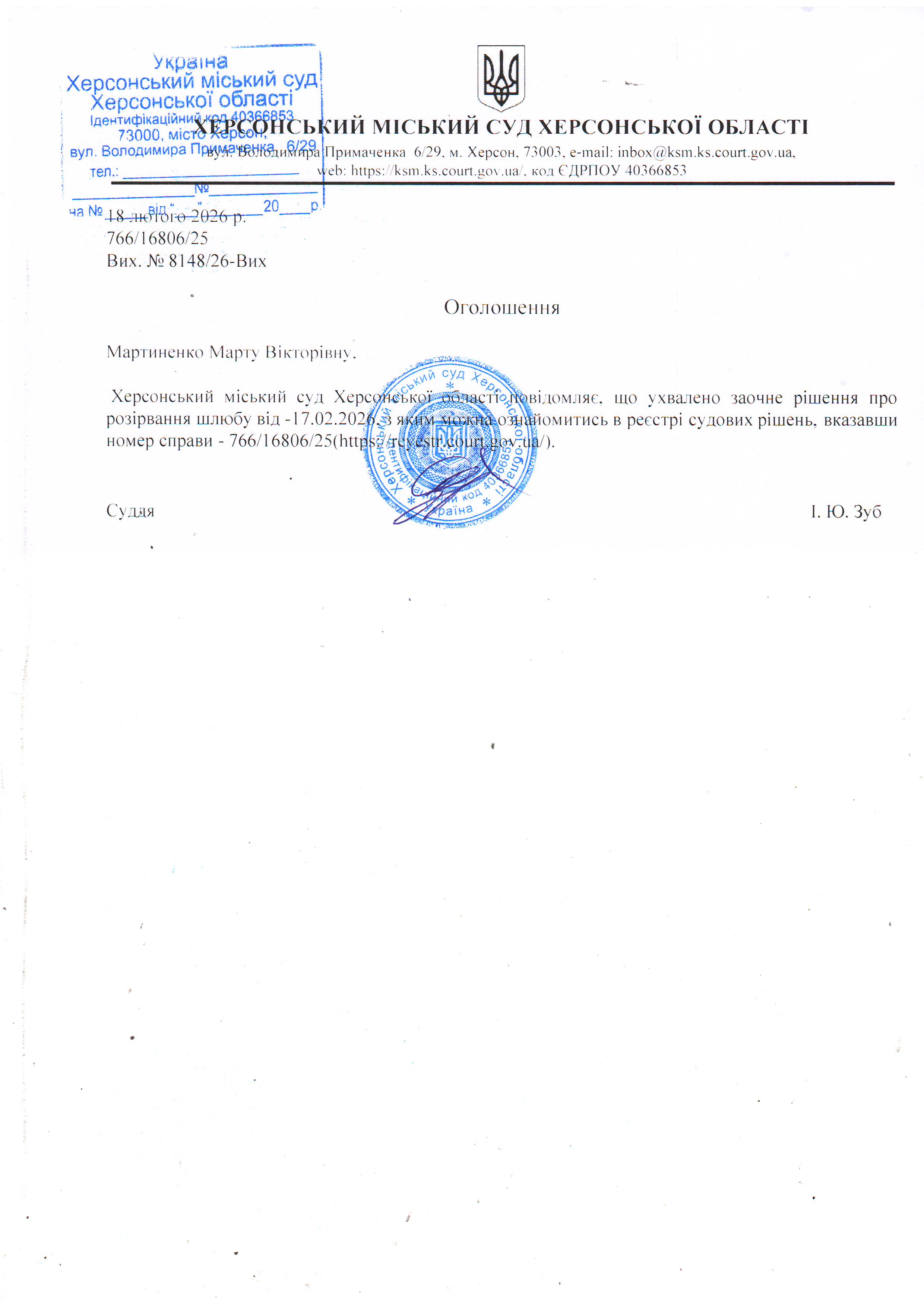 Оголошення для Мартиненко Марти Вікторівни про ухвалення заочного рішення