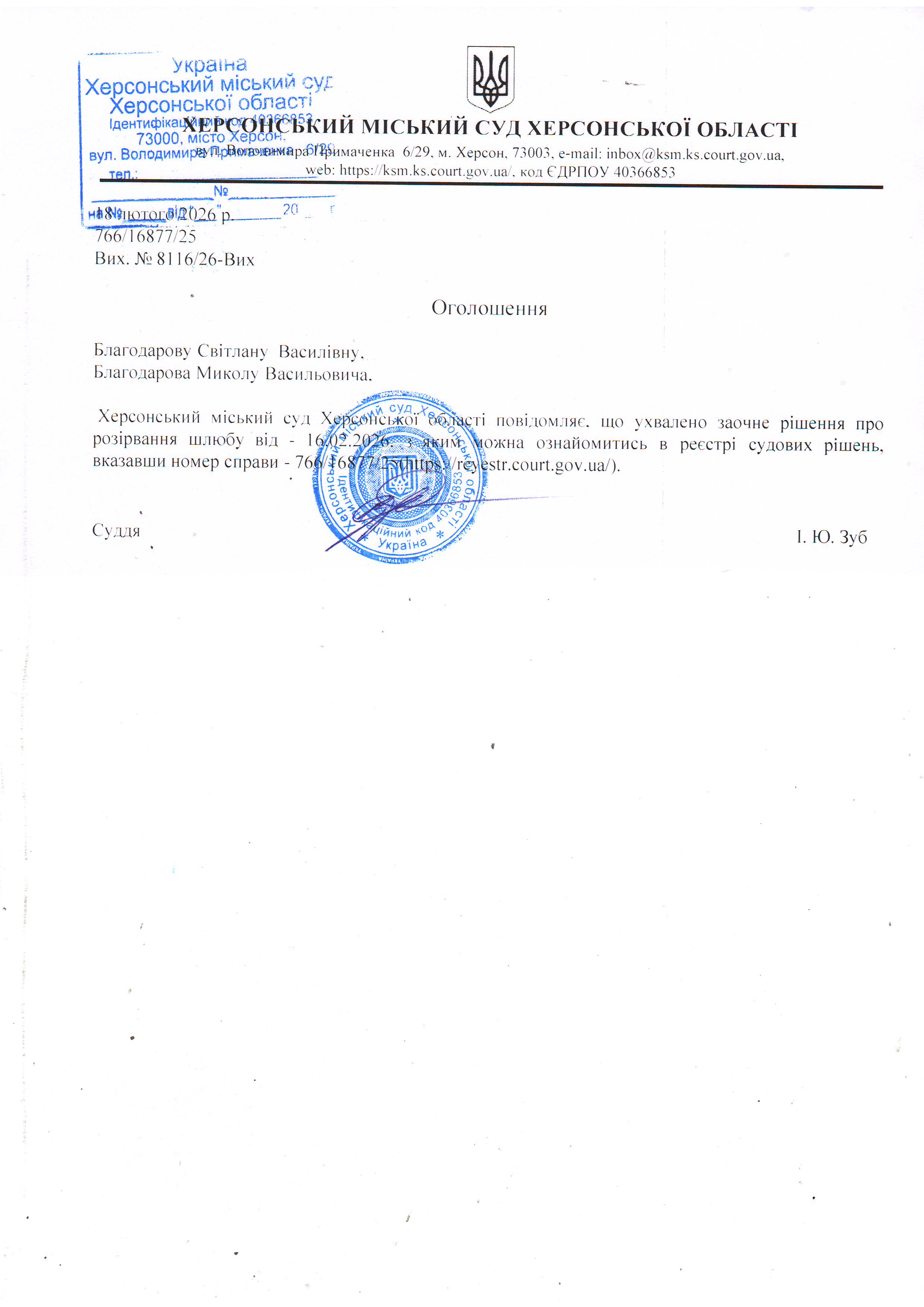 Оголошення для Благодарової Світлани Василівни, Благодарова Миколи Васильовича про ухвалення заочного рішення