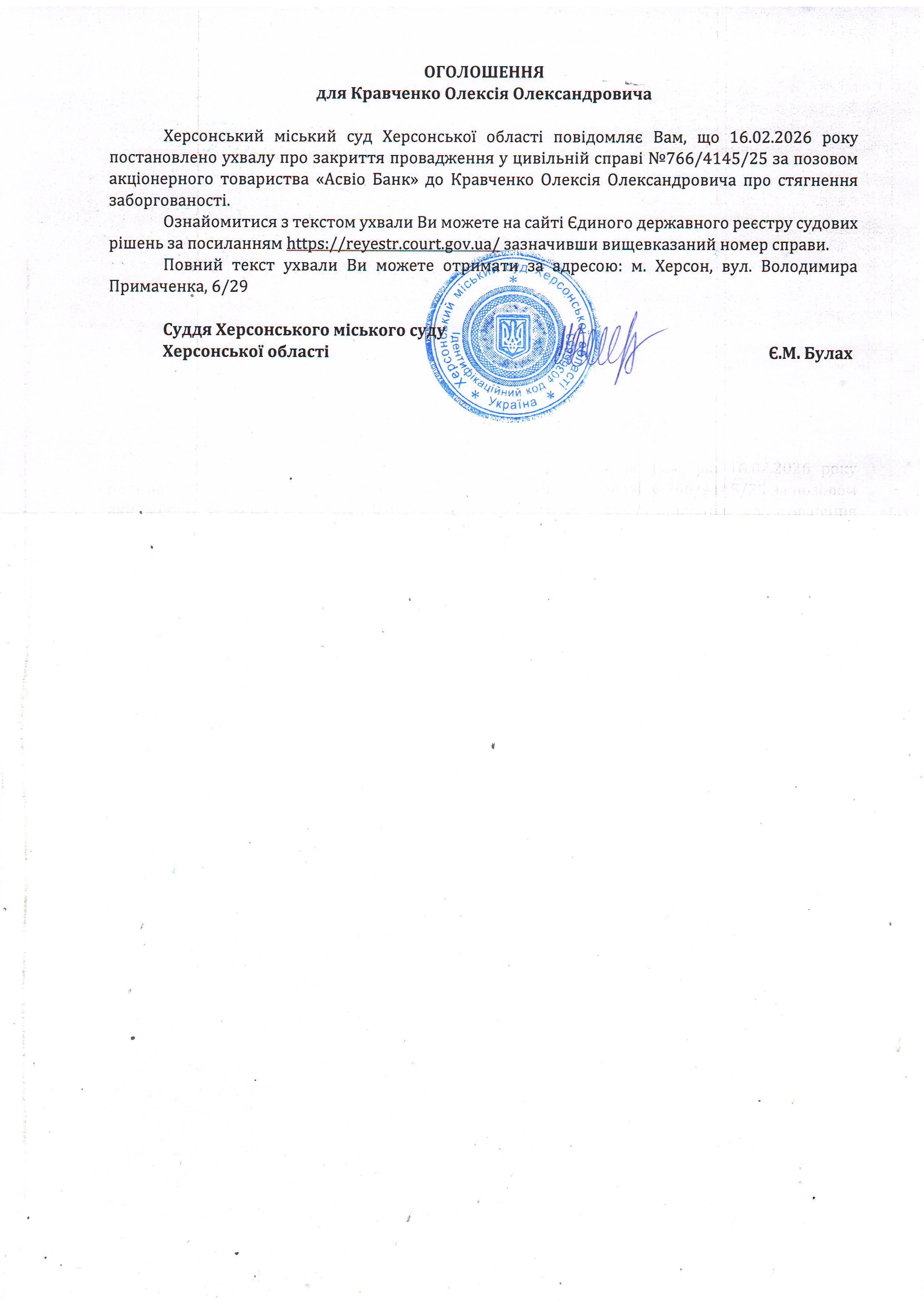 Оголошення для Кравченка Олексія Олександровича про постановлення ухвали