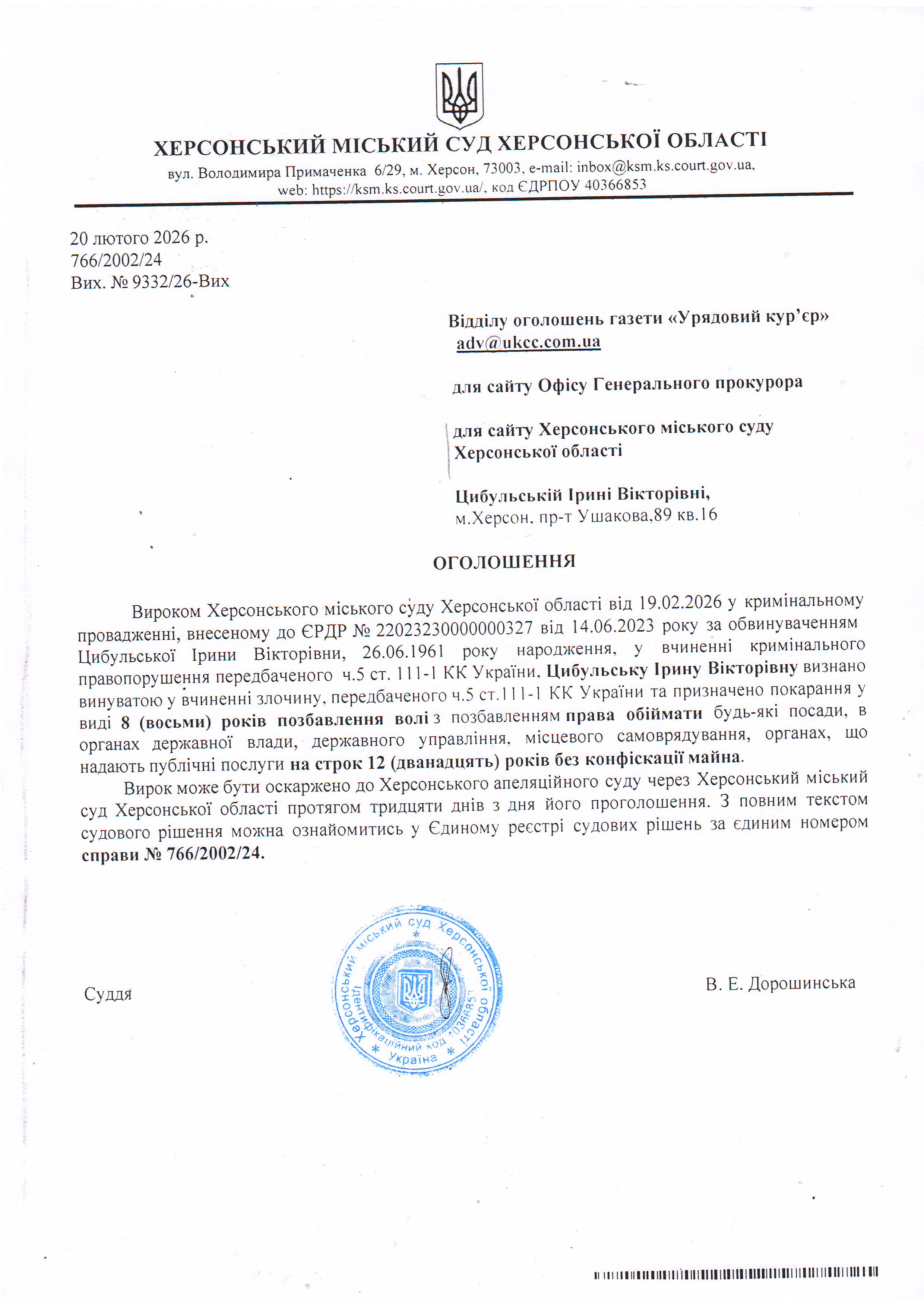 Оголошення для Цибульської Ірини Вікторівни