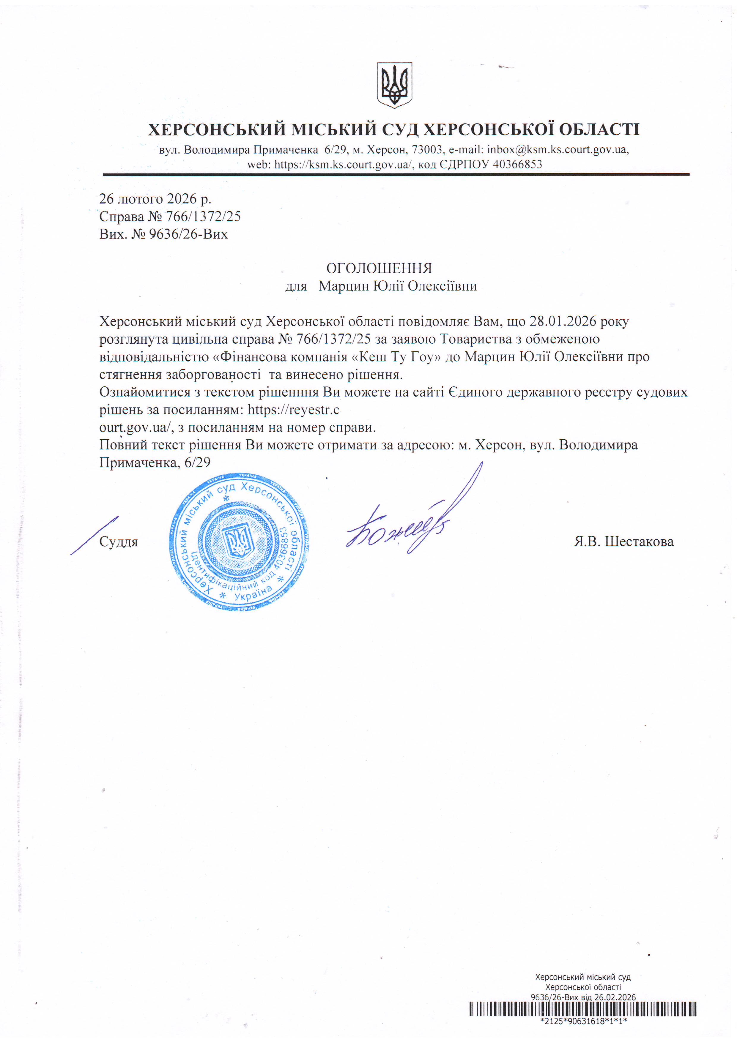 Оголошення для Марцин Юлії Олексіївни про винесення рішення