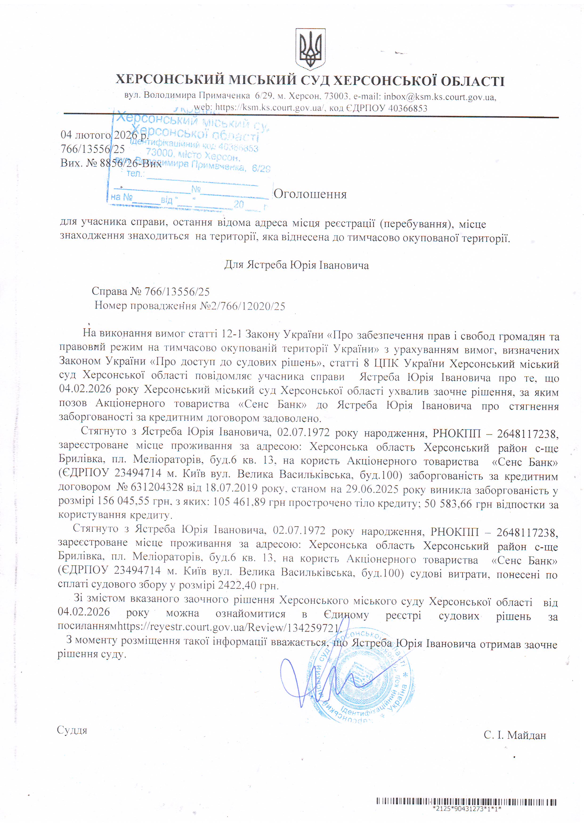 Оголошення для Ястреба Юрія Івановича про ухвалення заочного рішення