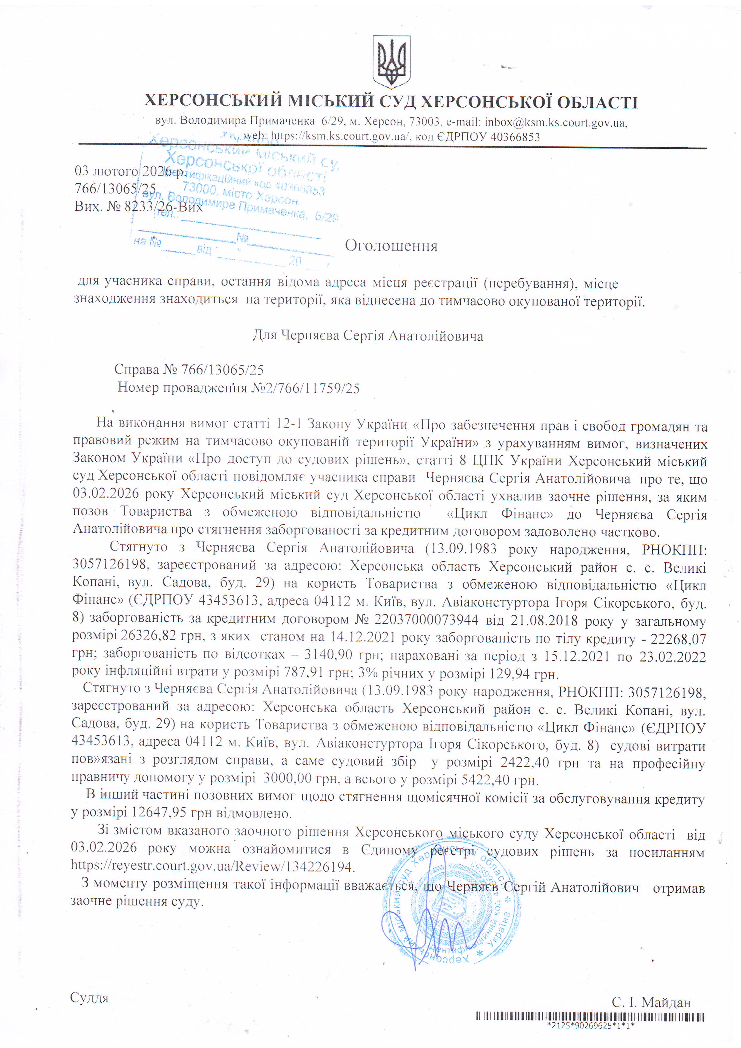 Оголошення для Черняєва Сергія Анатолійовича про ухвалення заочного рішення